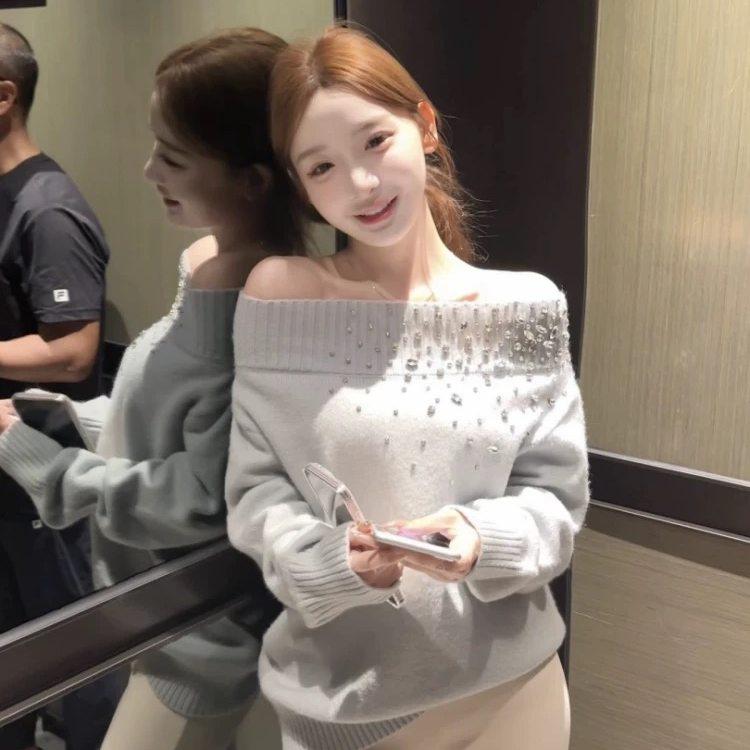 法式一字肩重工钉珠针织衫女秋冬新款设计感小众宽松显瘦毛衣上衣
