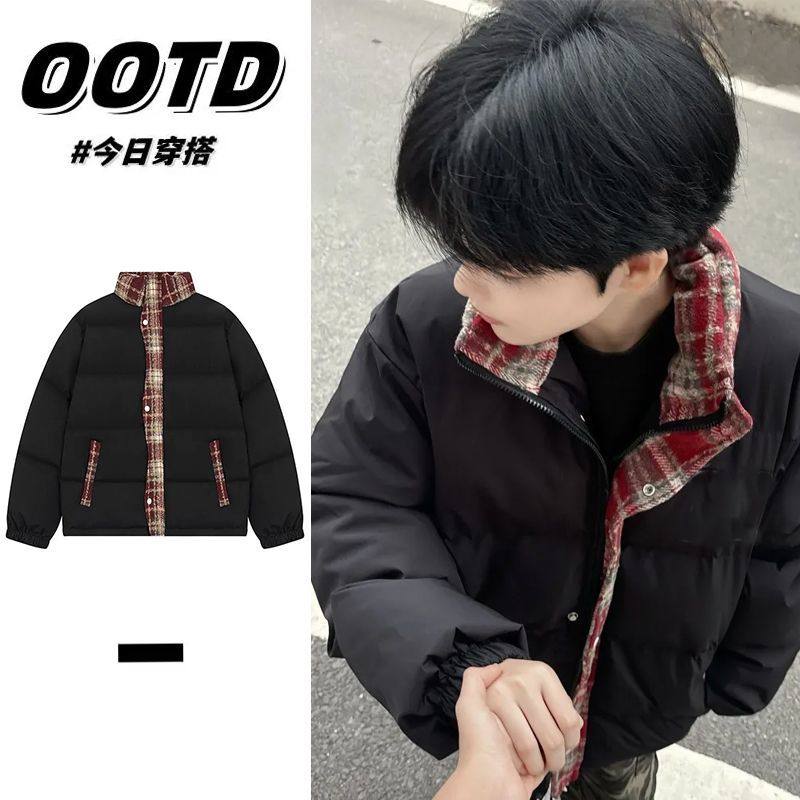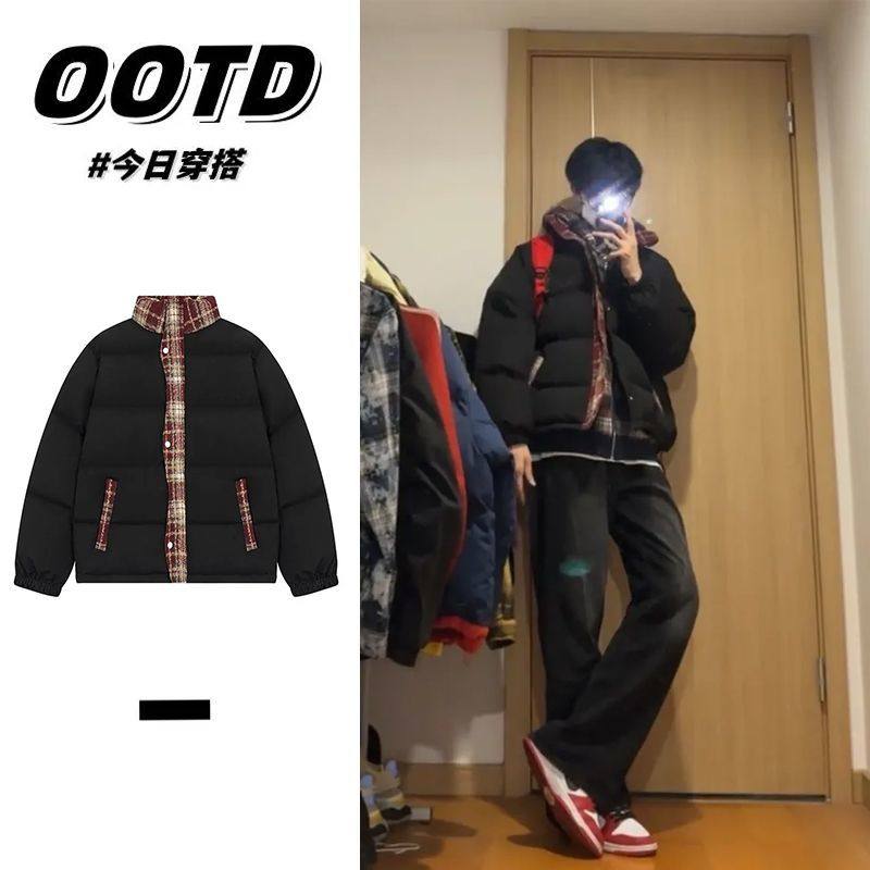 韩版复古格子拼接棉衣棉服男女款冬季加厚保暖立领面包服棉袄外套