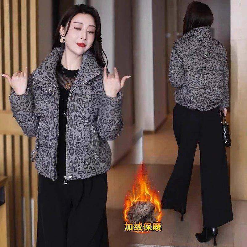 香港代购妈妈装豹纹棉衣女冬季新款时髦保暖印花面包服棉袄短外套