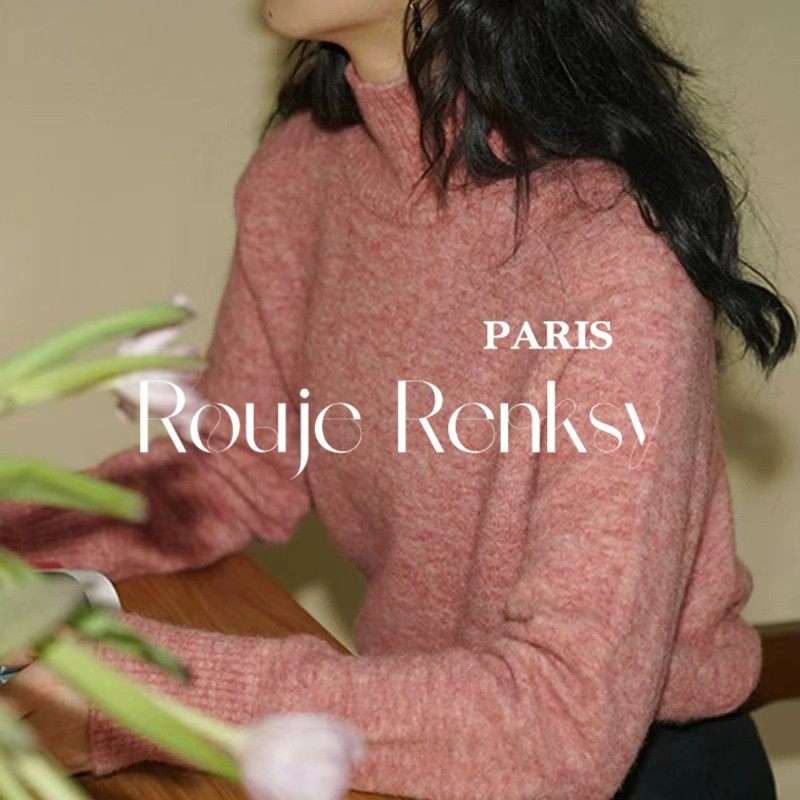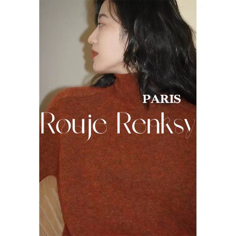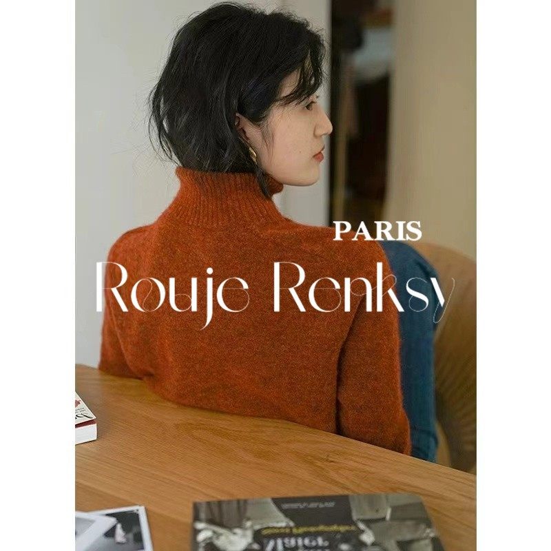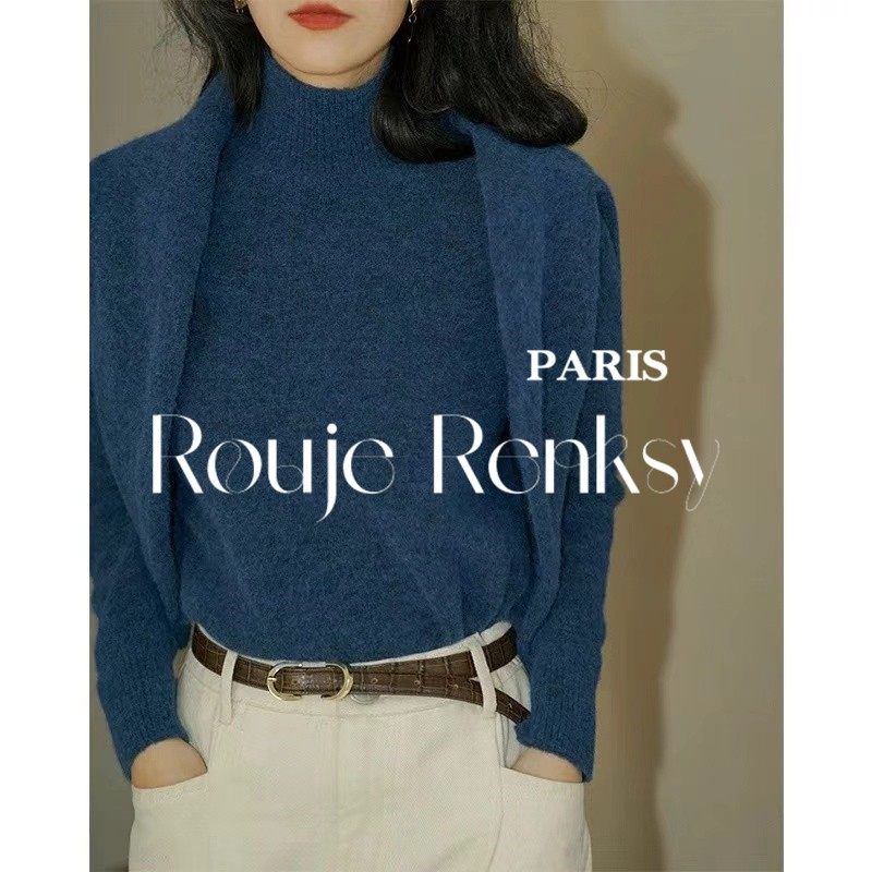 法国rouje renksy冬季设计感复古蓝色高领法式浣熊绒针织衫毛衣女