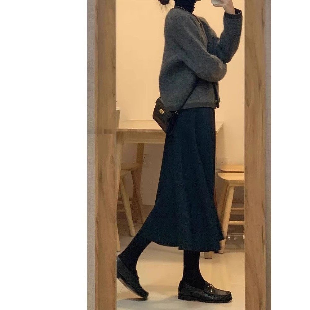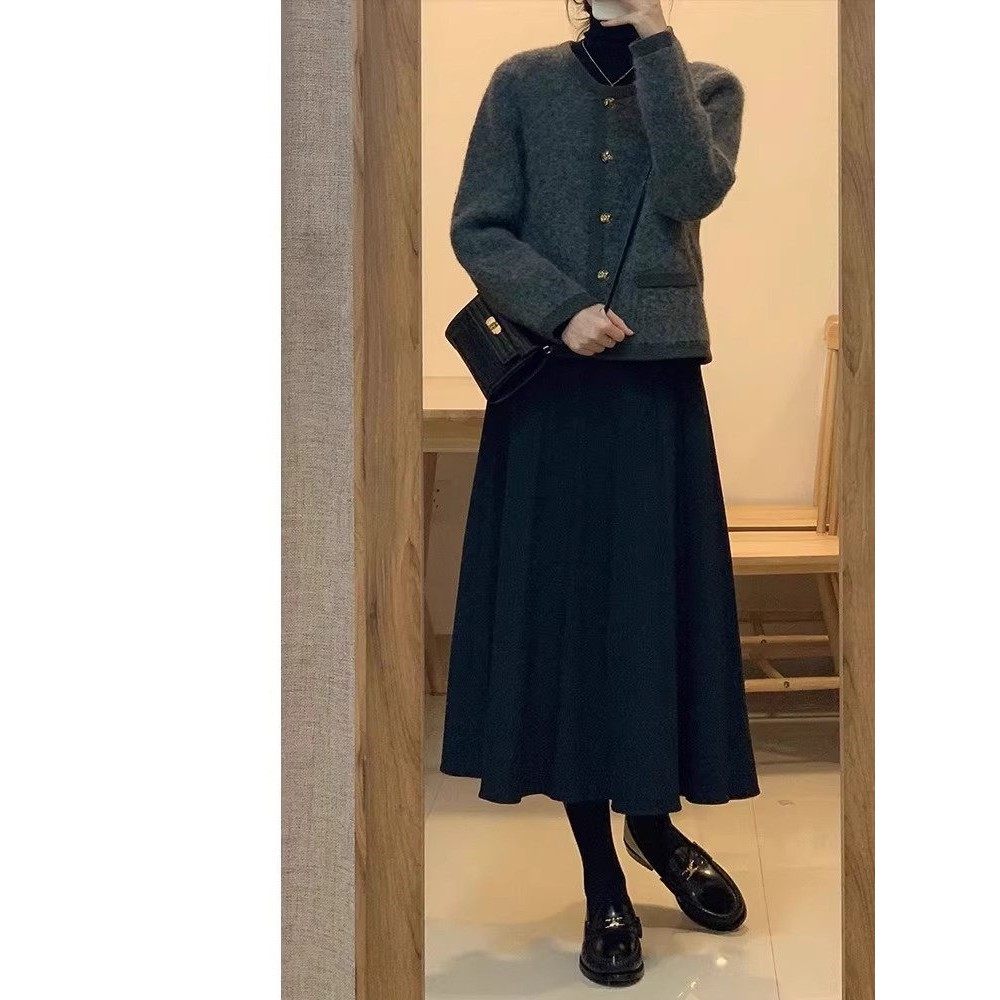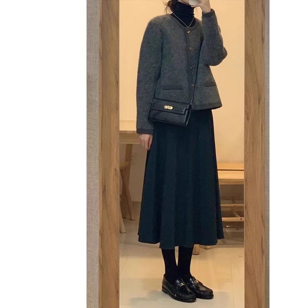 Rouje Naive黑色毛呢女秋新款高腰显瘦a字裙身材遮胯中长款半身裙