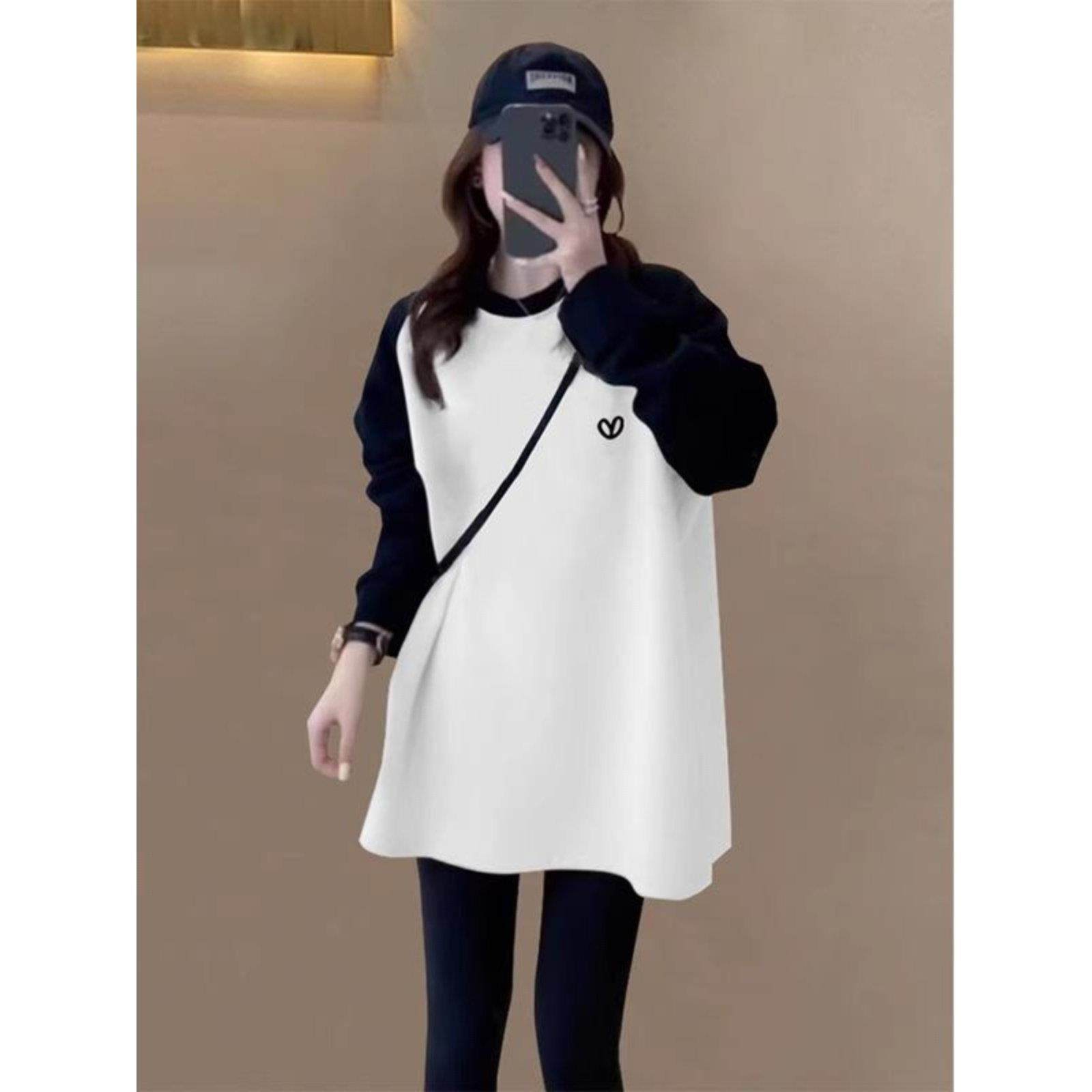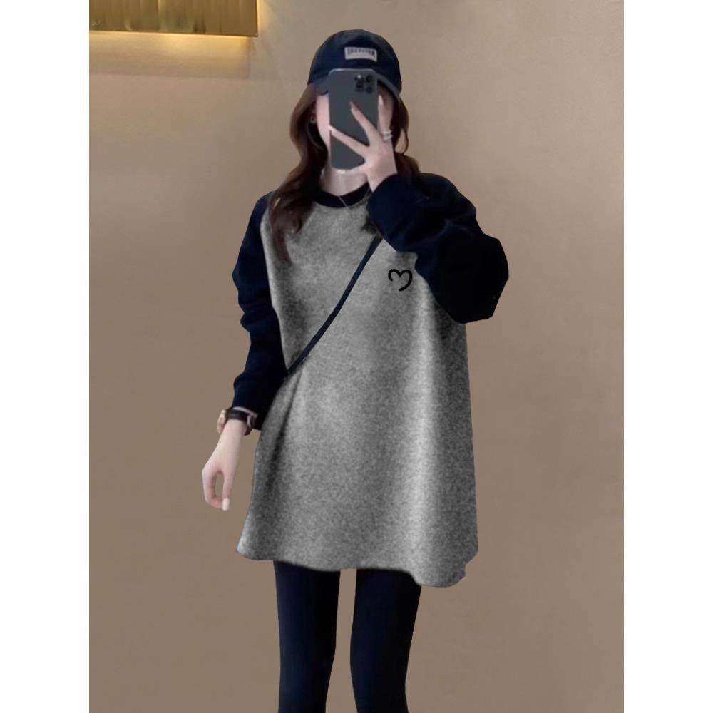 首页> 女装> 撞色磨毛长袖T恤女士秋季穿搭宽松内搭中长款打底衫配鲨鱼裤上衣
