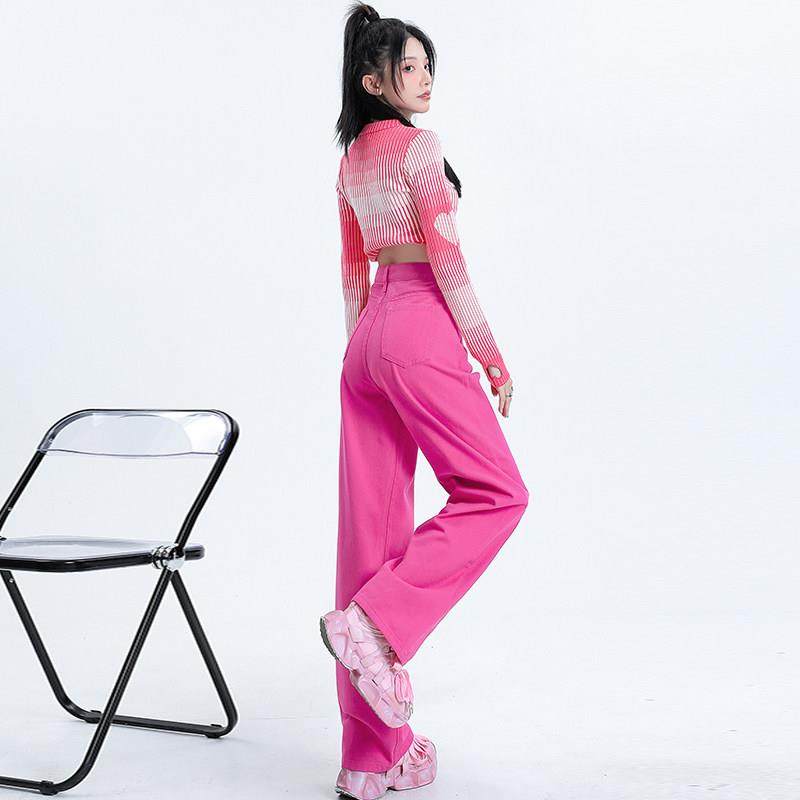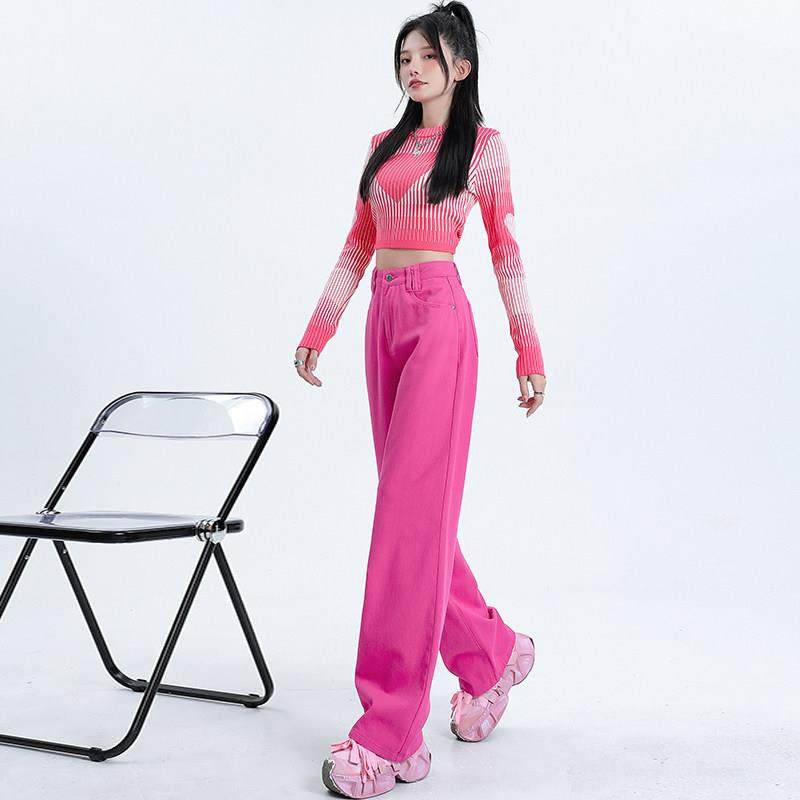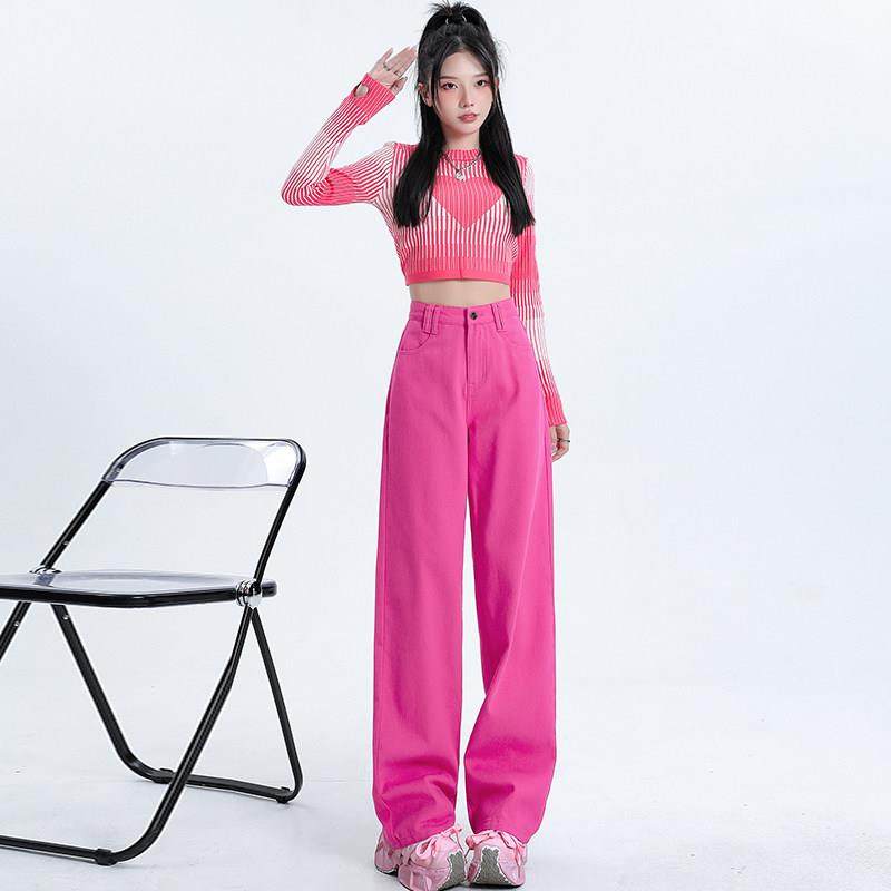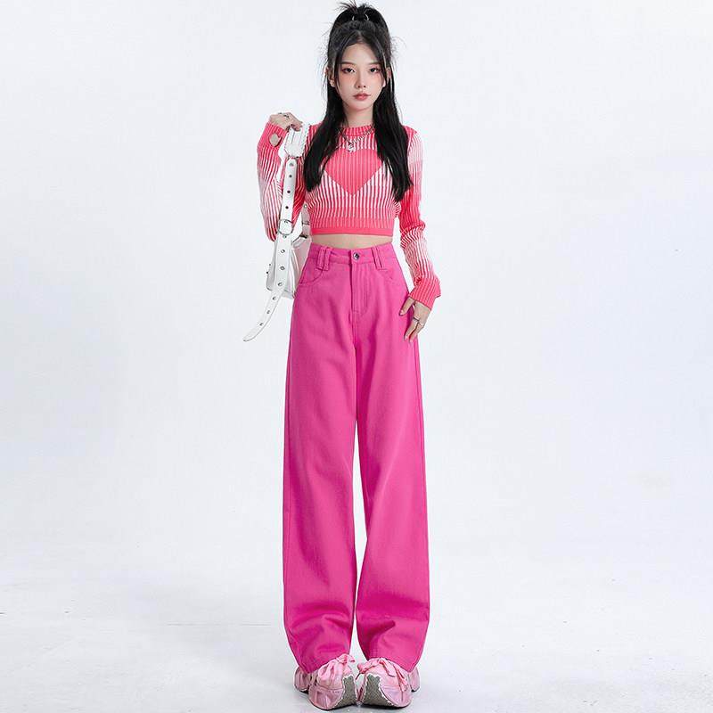 韩国玫红色牛仔裤女春秋高腰直筒显瘦梨型身材辣妹多巴胺阔腿裤冬