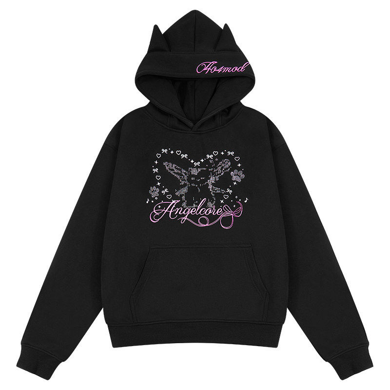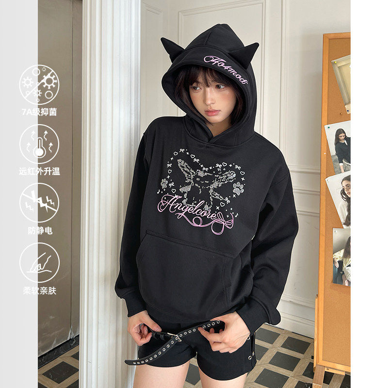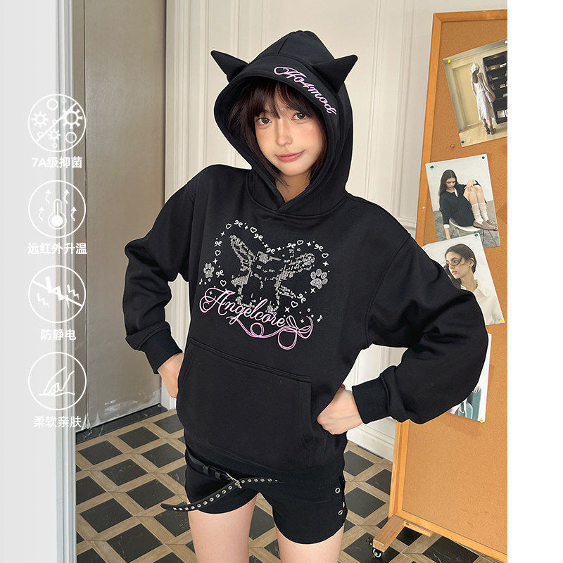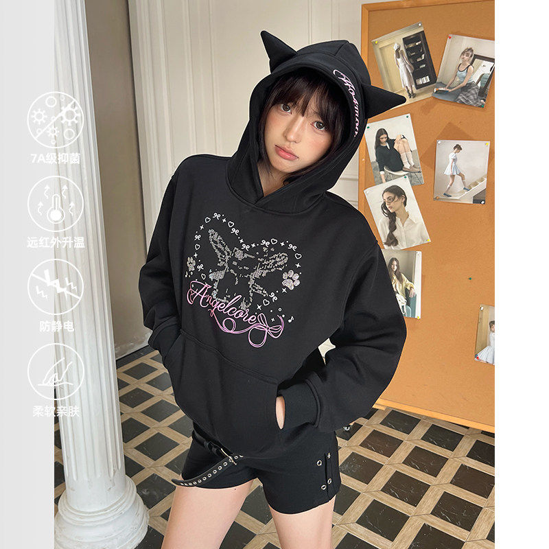 404MOB可爱耳朵小众设计Y2K辣妹女装短款加绒加厚连帽烫钻卫衣女
