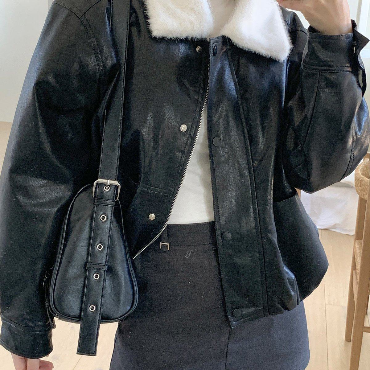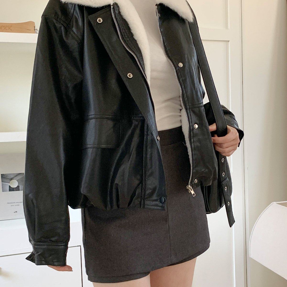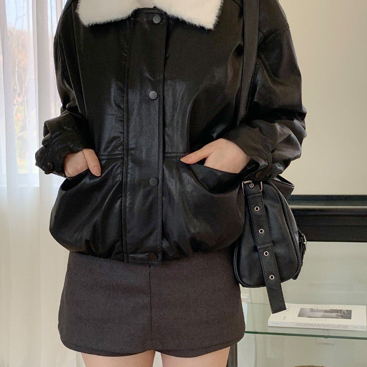 韩版冬毛毛翻领加绒加厚保暖港风时尚短款机车服PU皮夹克短外套女
