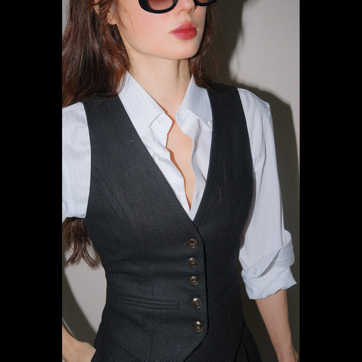 LISAYU黑色毛呢羊毛双排扣马甲粉蓝衬衣两件套装呢子马甲衬衣套装