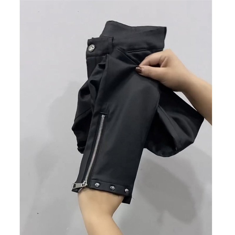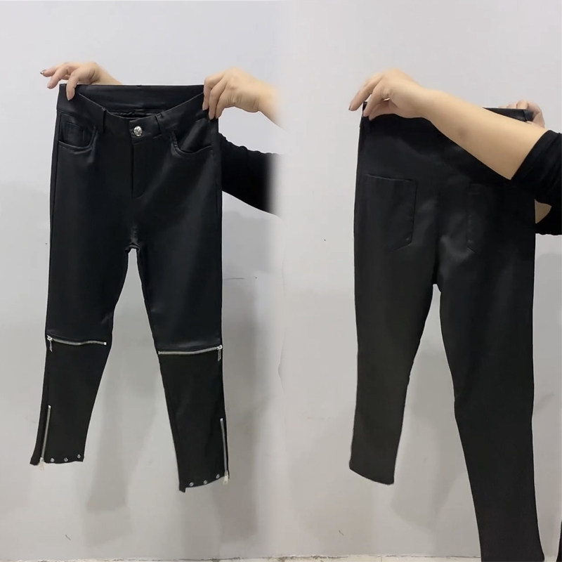 2022冬季新款加绒涂层皮裤女弹力修身铆钉拉链八分小脚铅笔裤潮