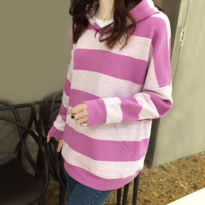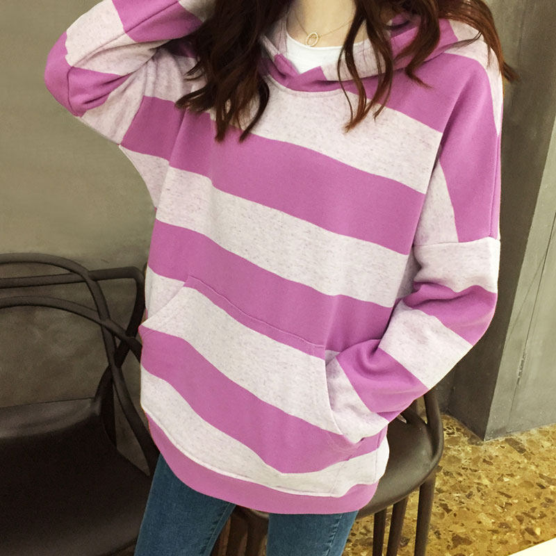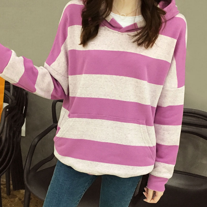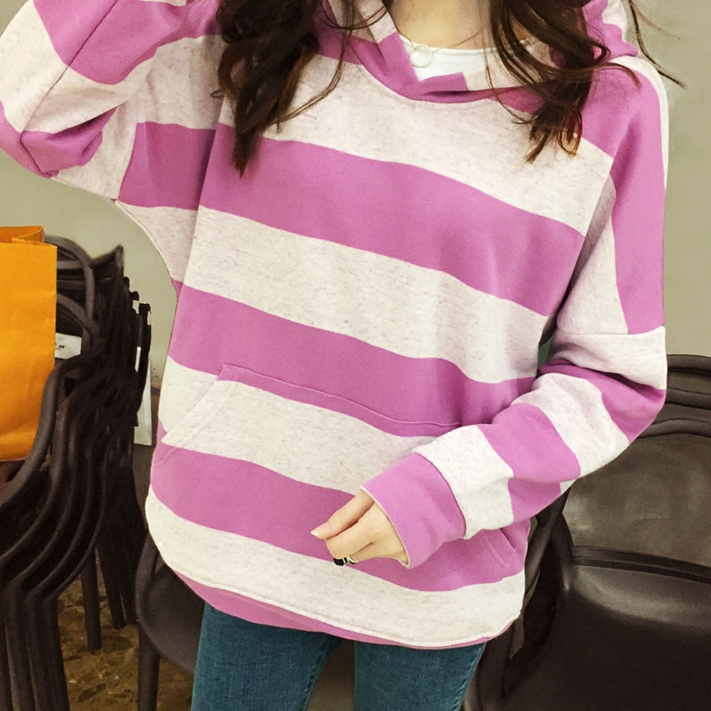 韩国东大门2023春秋新款可爱的连帽宽条纹女子卫衣棉社会百搭宽松