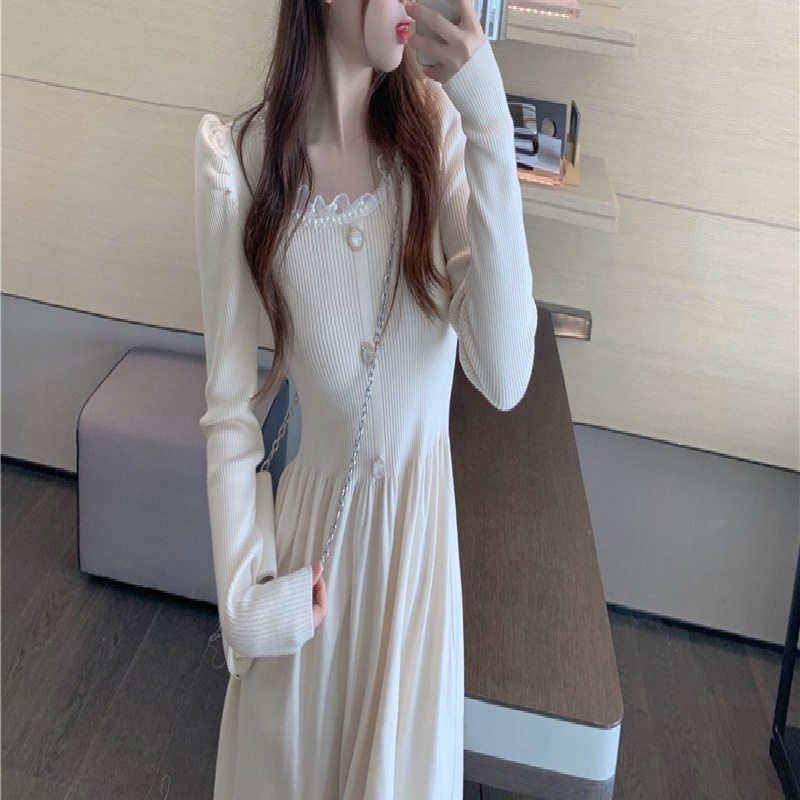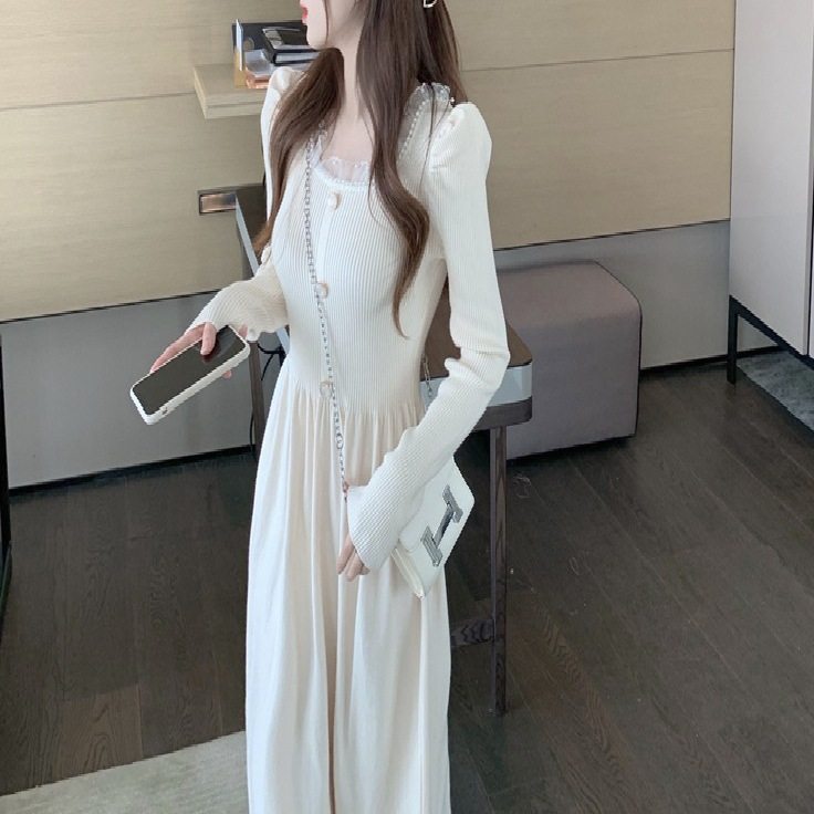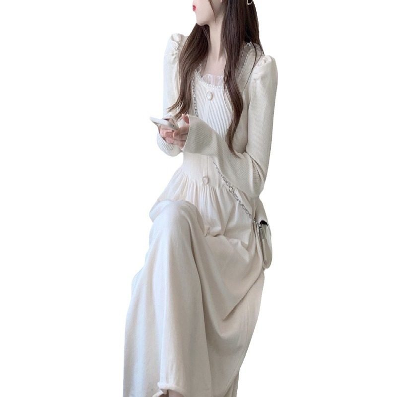 法式复古女装长袖连衣裙2024秋冬蕾丝花边钉珠修身显瘦气质针织裙
