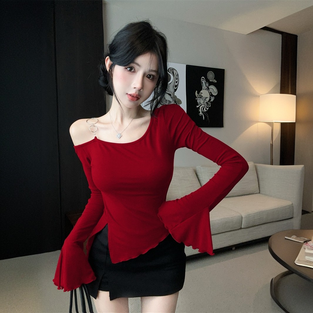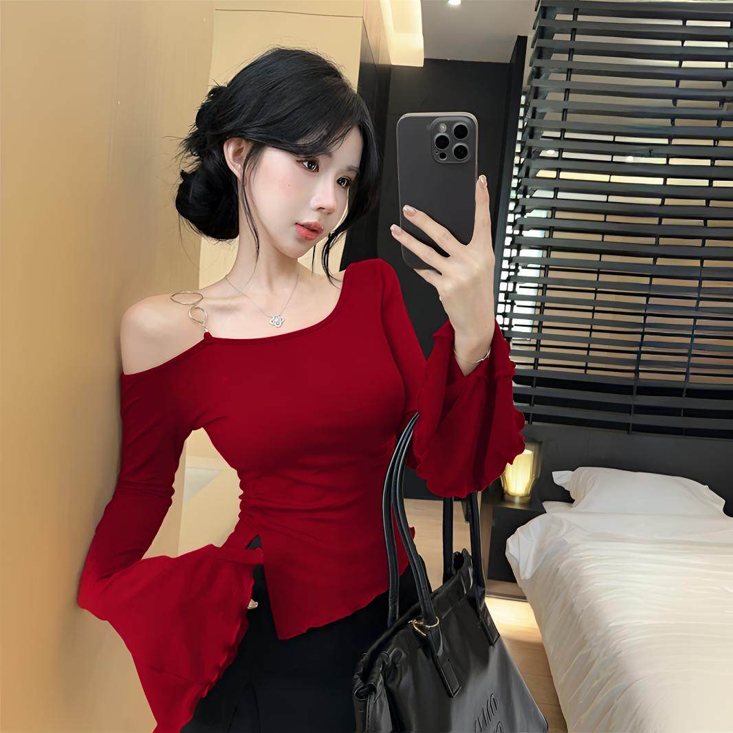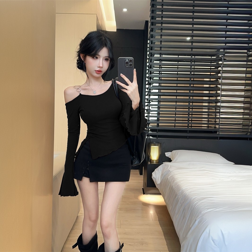 2025新款不规则斜肩长袖t恤女秋冬纯欲辣妹一字肩上衣打底衫内搭
