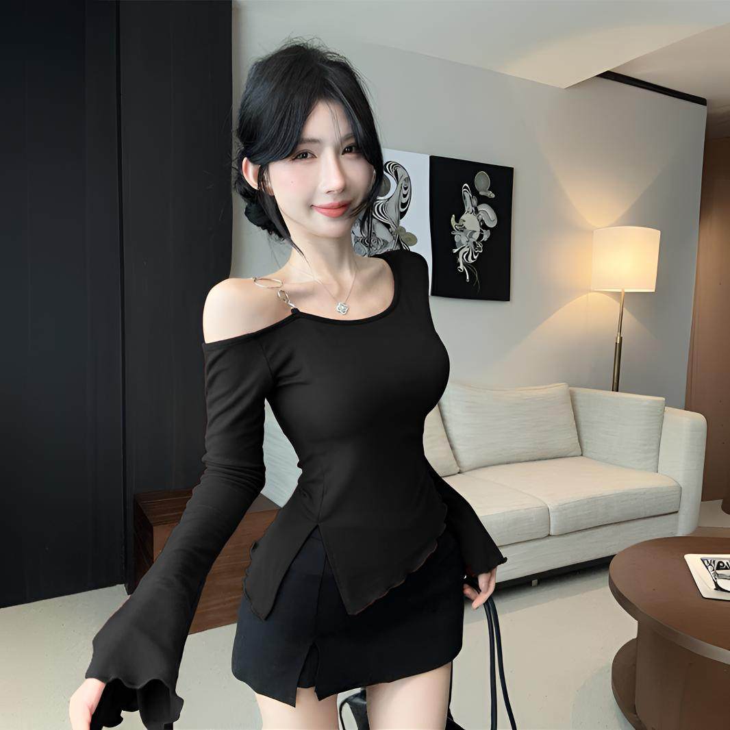 首页> 女装> 2025新款不规则斜肩长袖t恤女秋冬纯欲辣妹一字肩上衣打底衫内搭