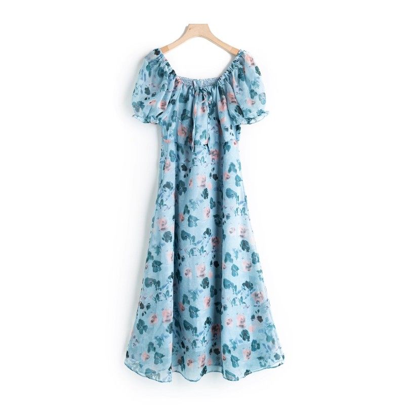 法式印花连衣裙 复古方领泡泡袖收腰显瘦背面打揽短袖女裙 L13922