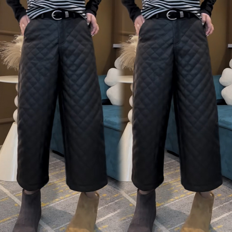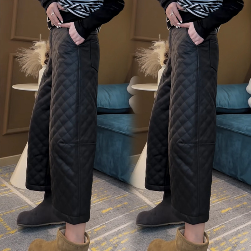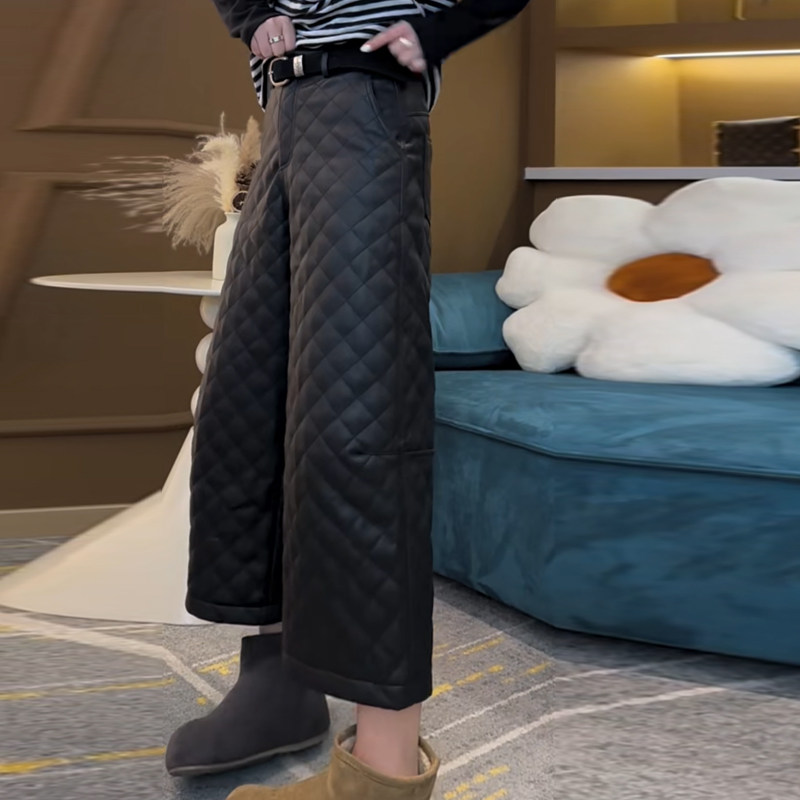 欧货阔腿加厚棉裤女2025秋冬新款高腰菱格款显瘦简约百搭九分皮裤