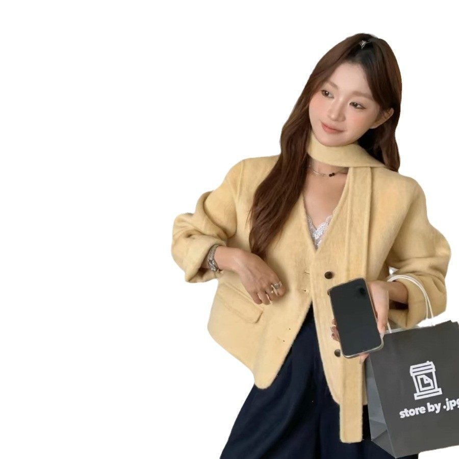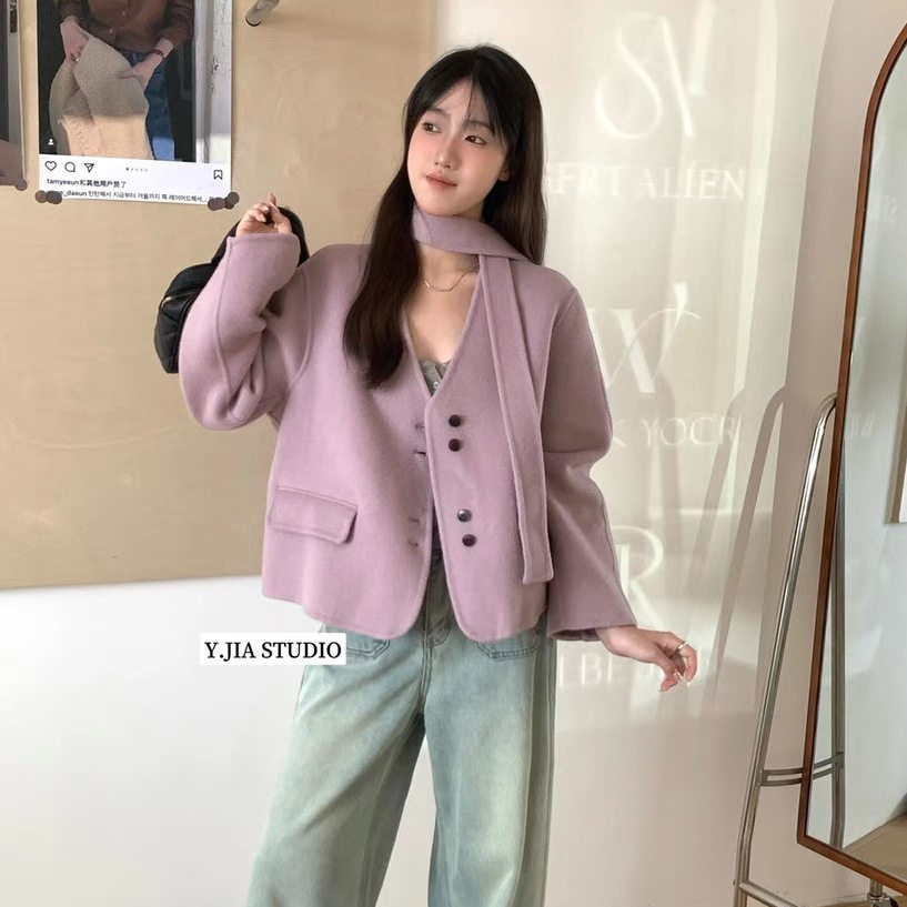 2025秋冬季款时尚甜美气质感V领短款东大门新款毛呢外套