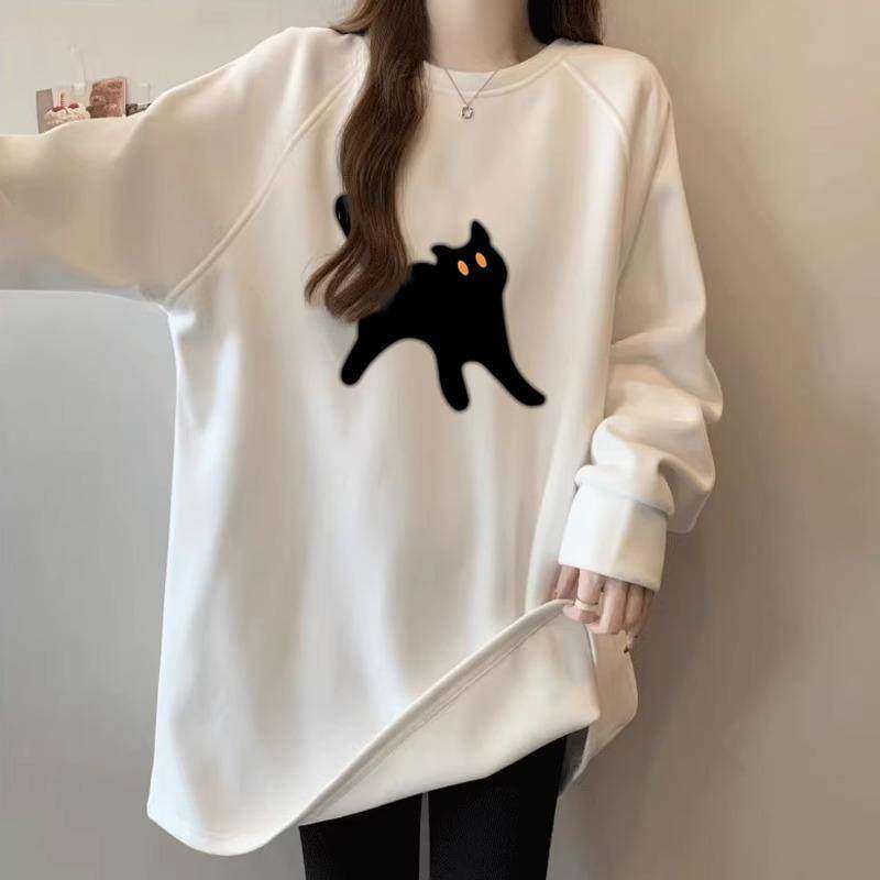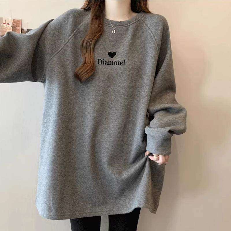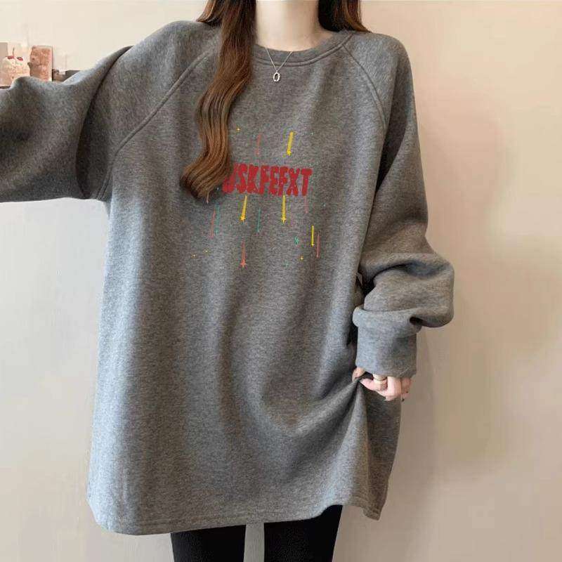 灰色中长款慵懒长袖卫衣女秋冬欧货大版插肩打底衫配鲨鱼裤的上衣