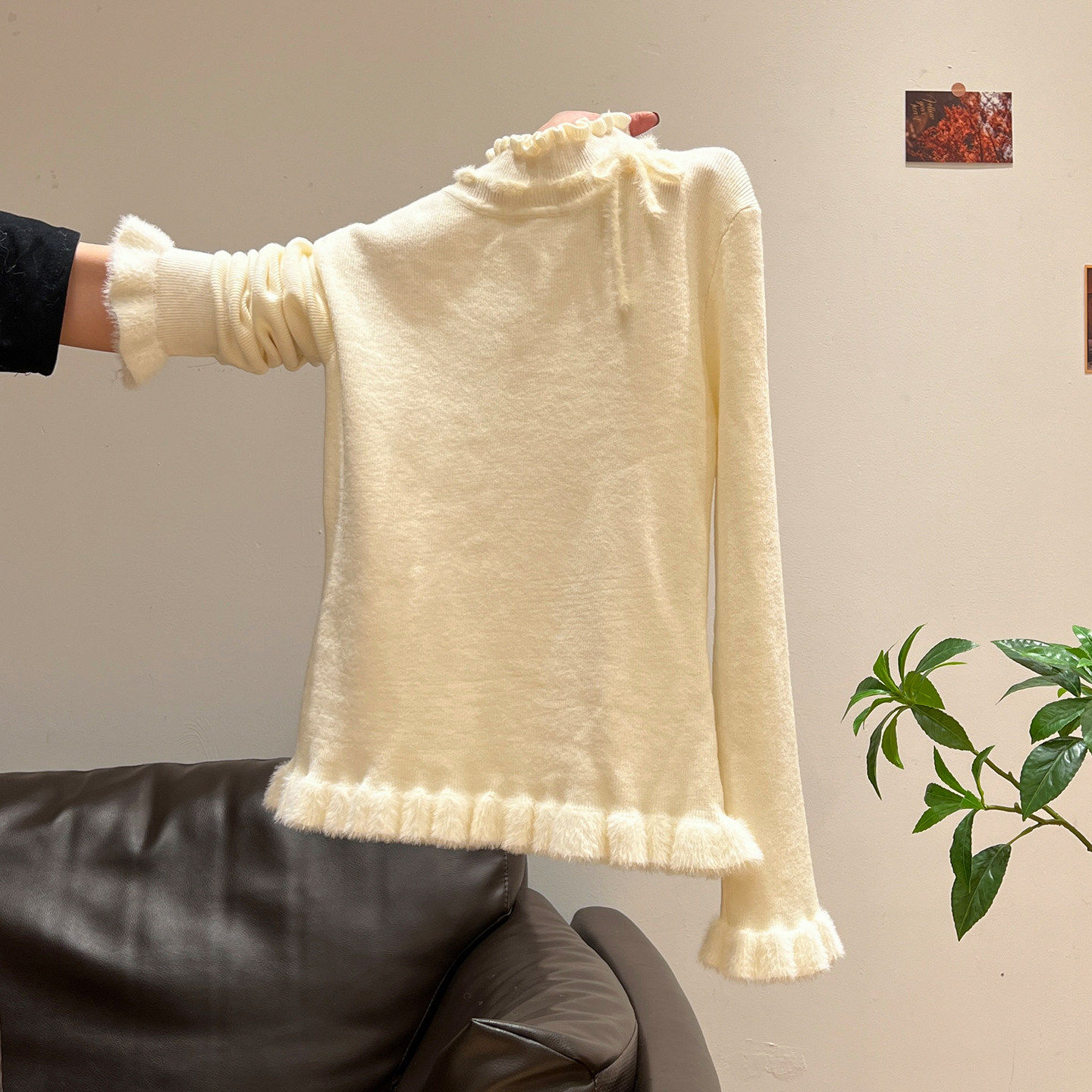 蝴蝶结木耳边半高领长袖针织打底衫内搭加厚毛衣秋冬可外穿上衣女