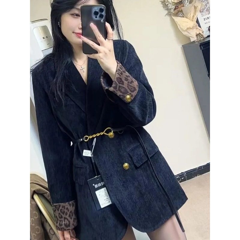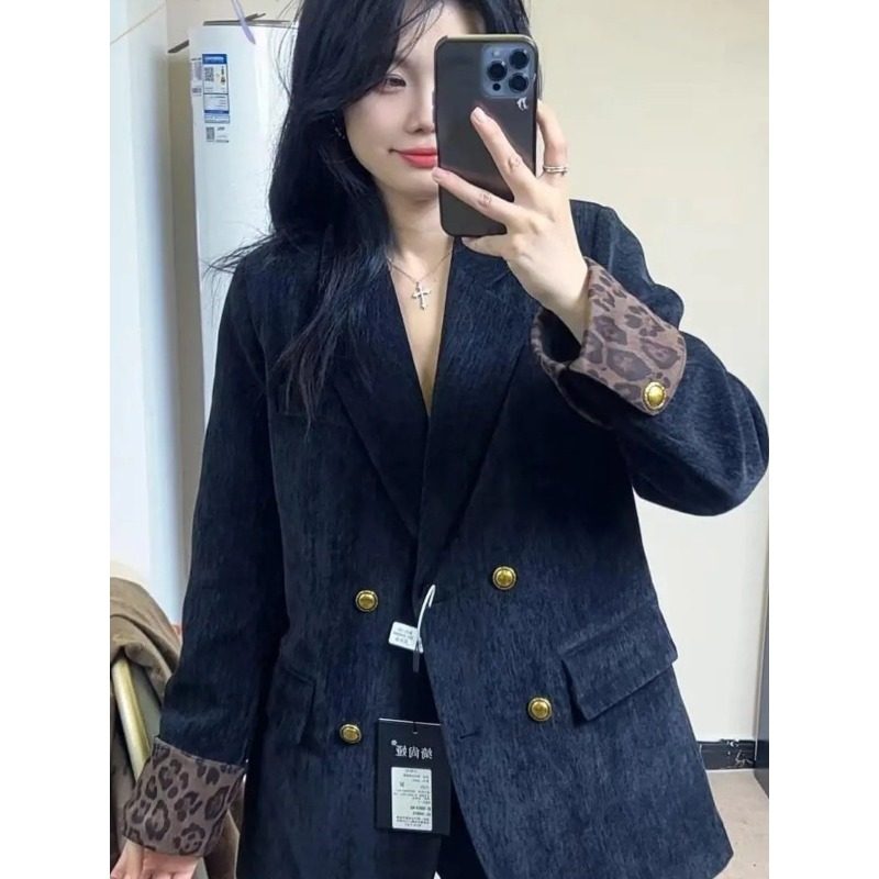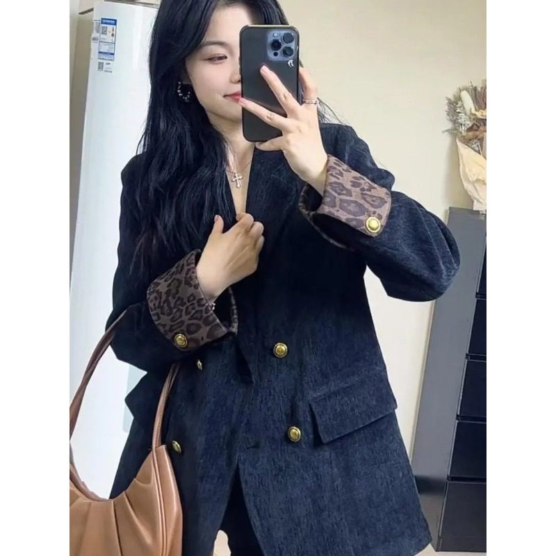 高级感黑色雪尼尔复古豹纹拼接西服外套女春秋冬夹棉气质西服个性