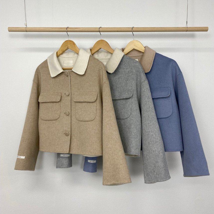 已出货 韩国chic秋冬减龄小清新撞色翻领短款毛呢外套女