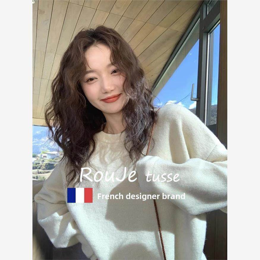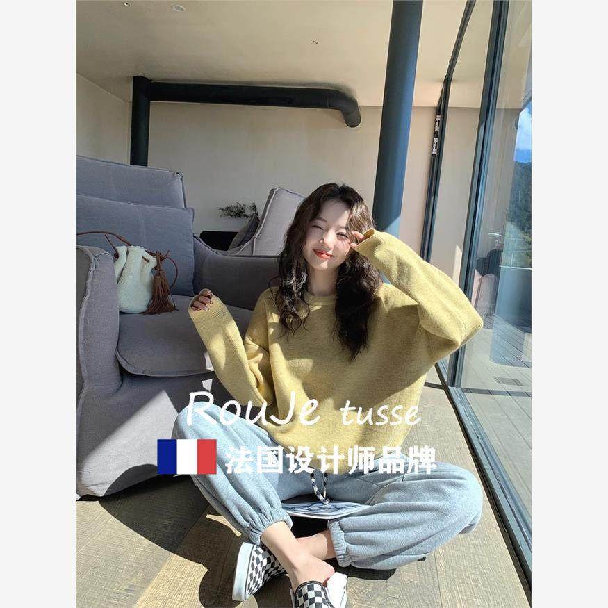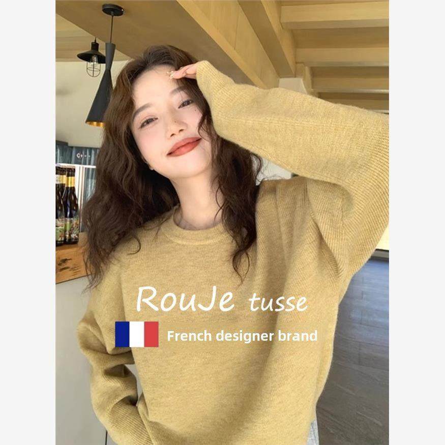 Rouje tusse克莱因蓝羊毛针织打底衫女秋冬慵懒宽松圆领羊绒毛衣