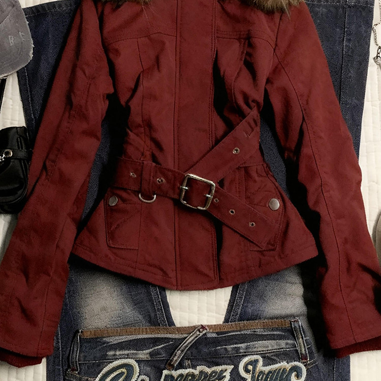 首页> 女装> 复古红色vintage毛领连帽外套女秋冬季新款设计感小众派克服上衣