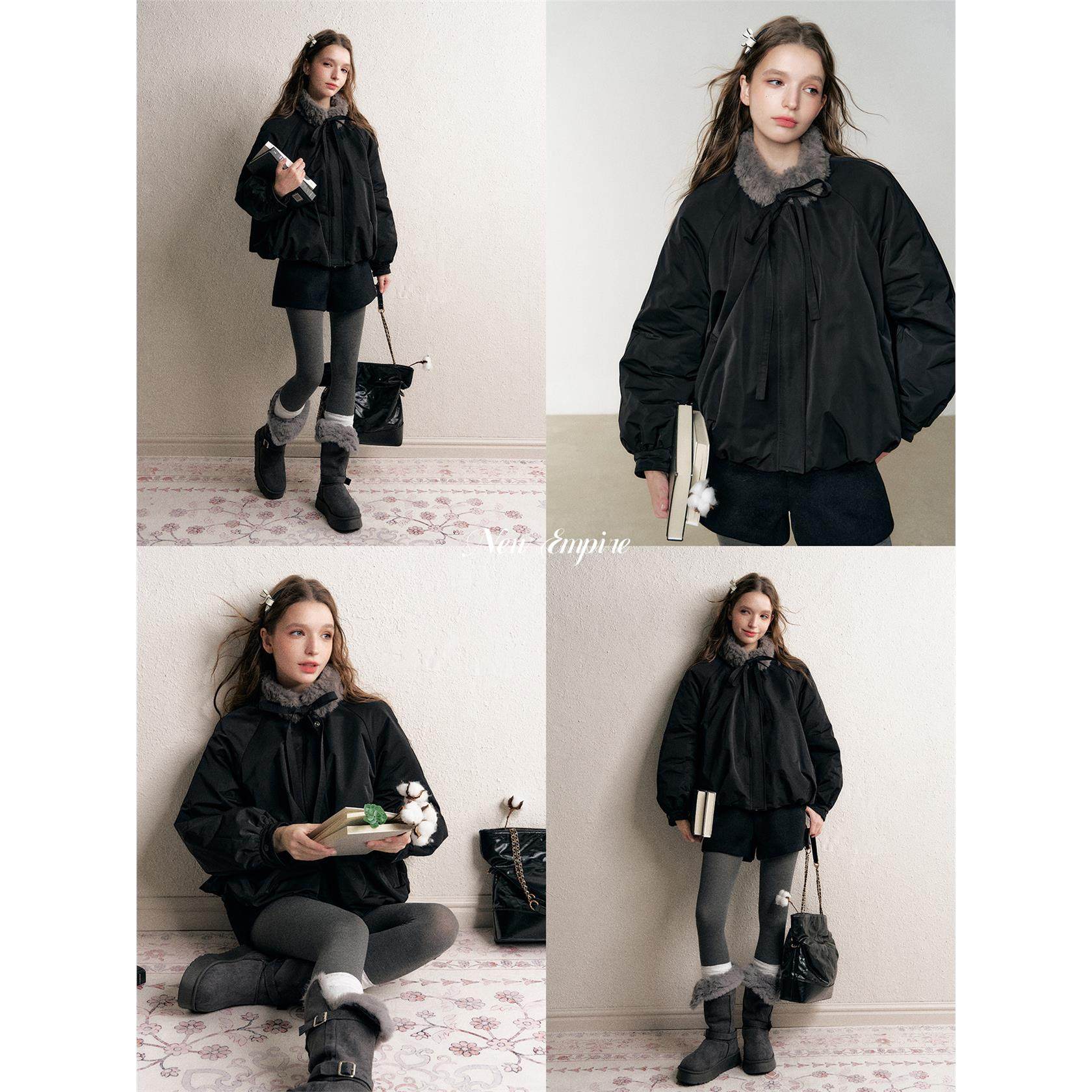 NEW EMPIRE25冬季新款设计感小众上衣毛领加厚黑色花苞棉服外套女