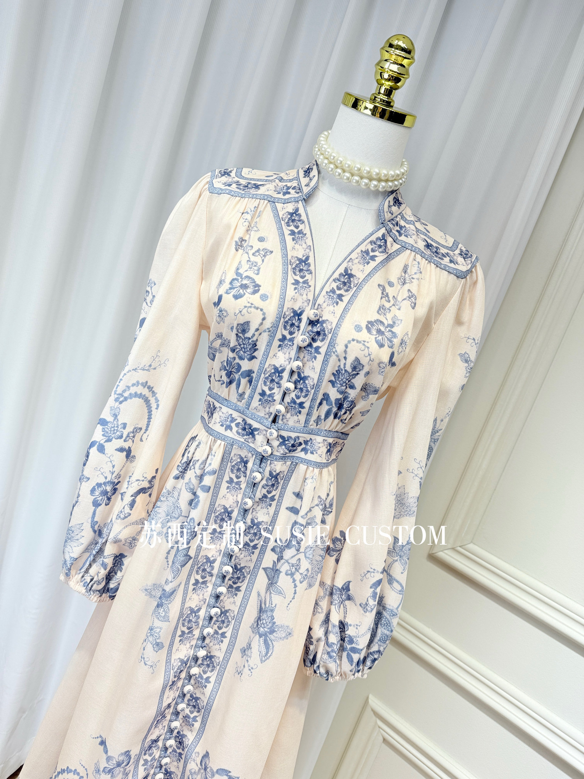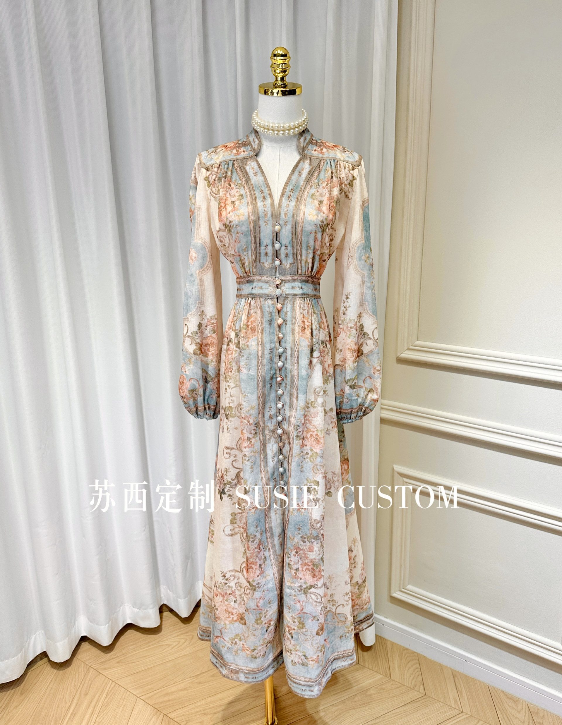 定制复古印花显气质V领单排扣泡泡袖收腰开叉长裙棉麻连衣裙