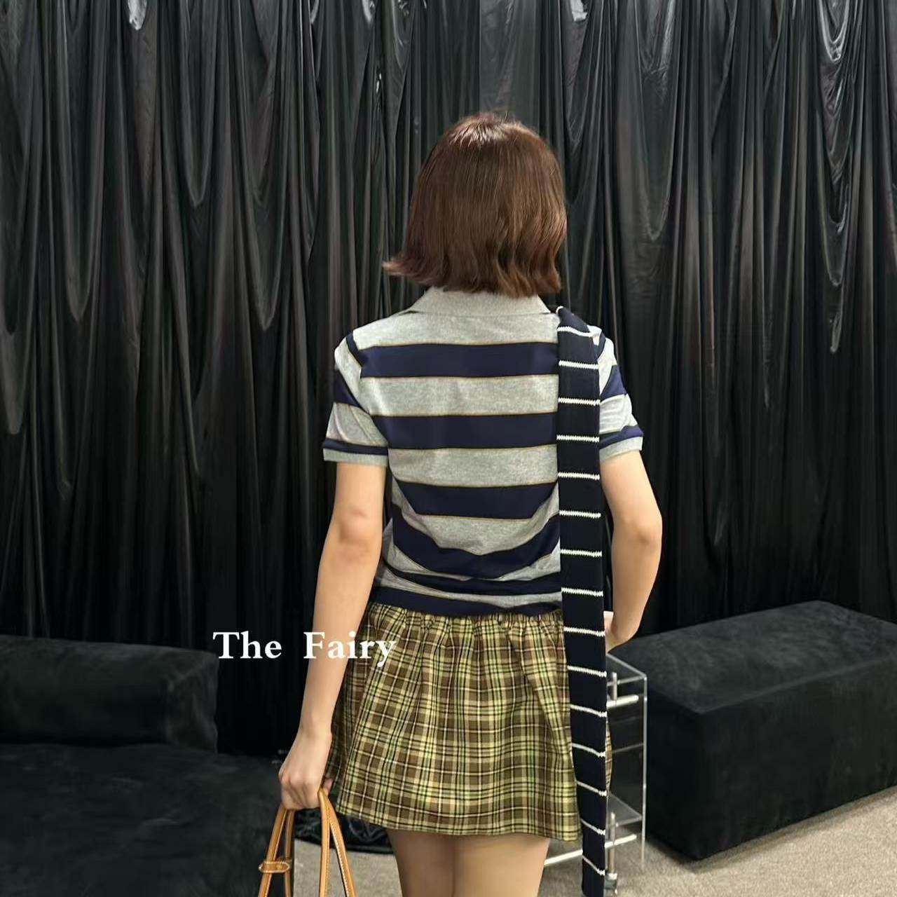 好漂亮灰蓝拼色翻领T恤女2025年早春新款短上衣名媛气质时尚显瘦