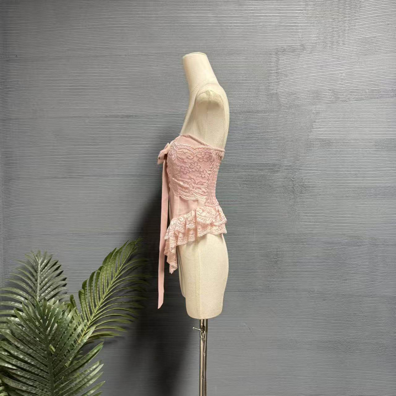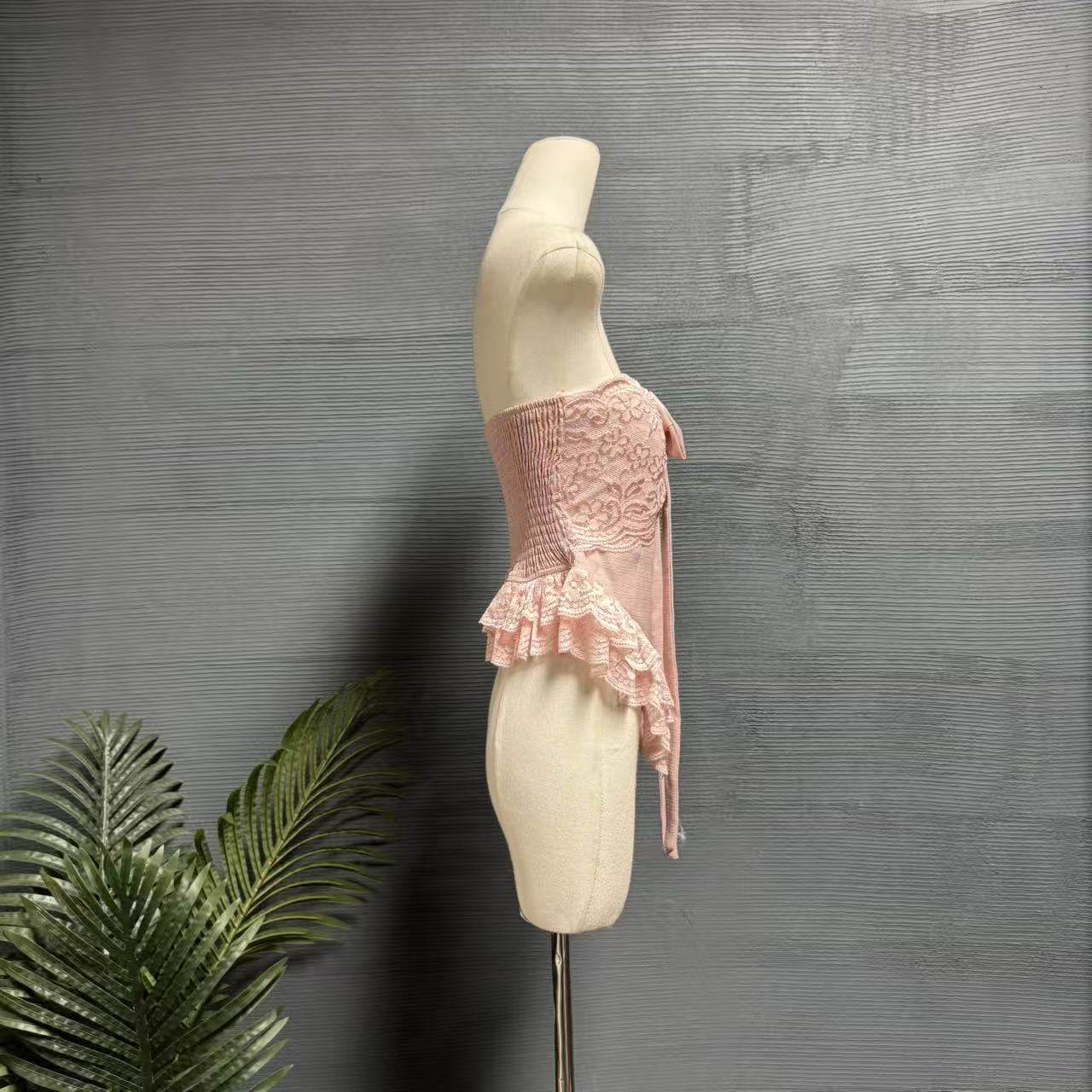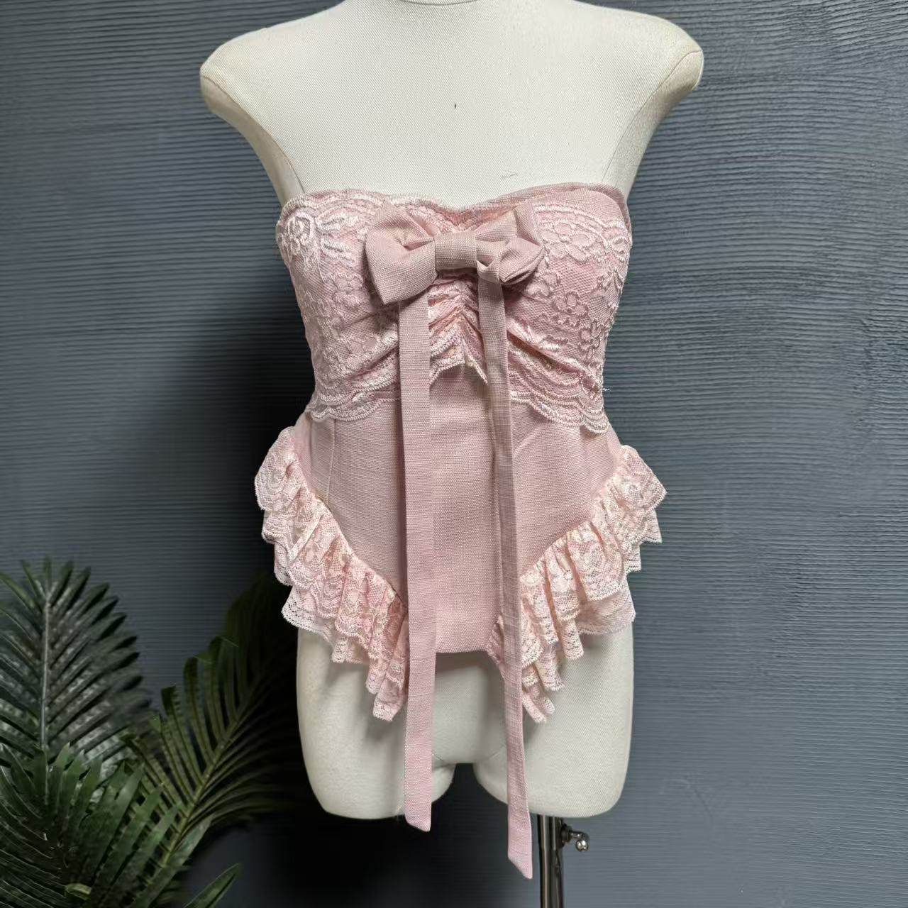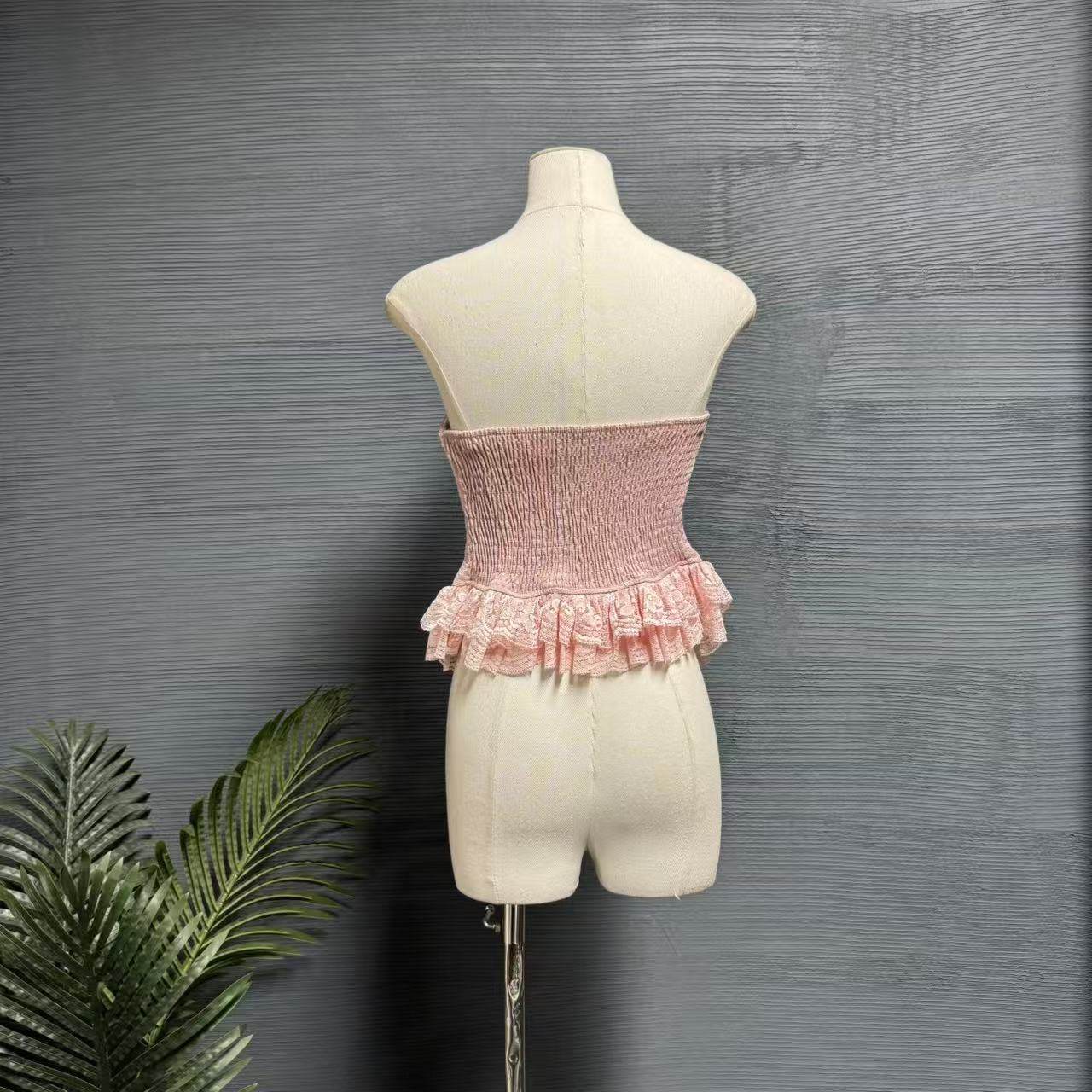 镜服饰2026夏季甜美风蕾丝抹胸女绑带荷叶边蝴蝶结修身上衣1444