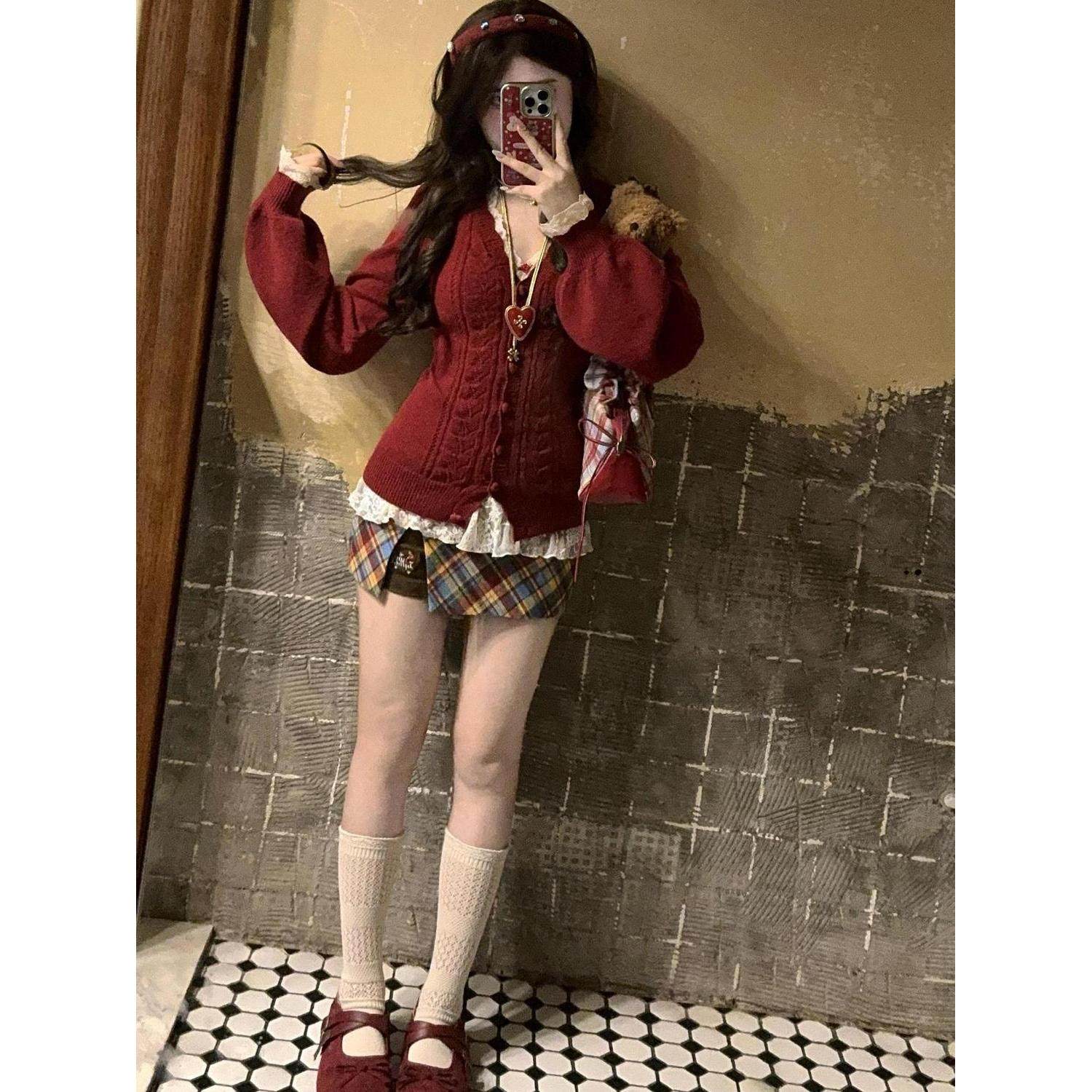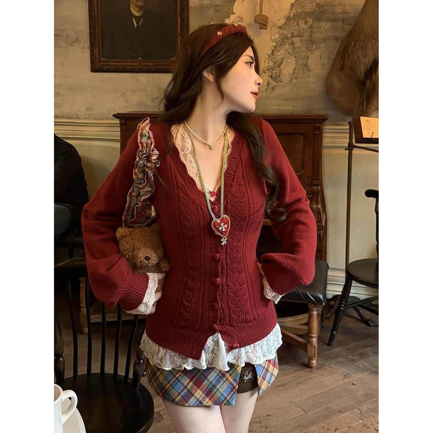 叠叠樱桃 秋冬新款v领爱心扣针织毛衣开衫外套蕾丝屁帘短裙女套装