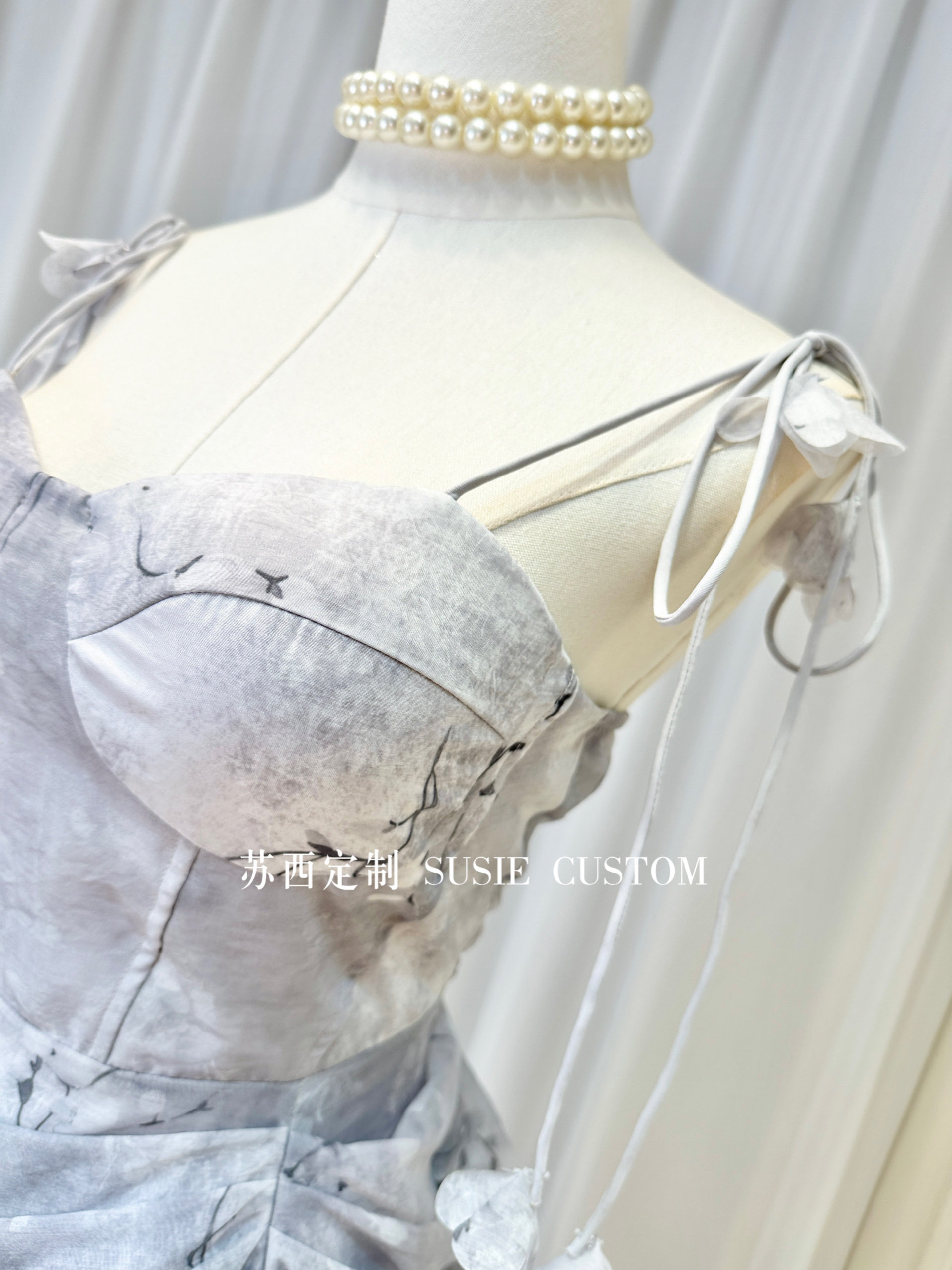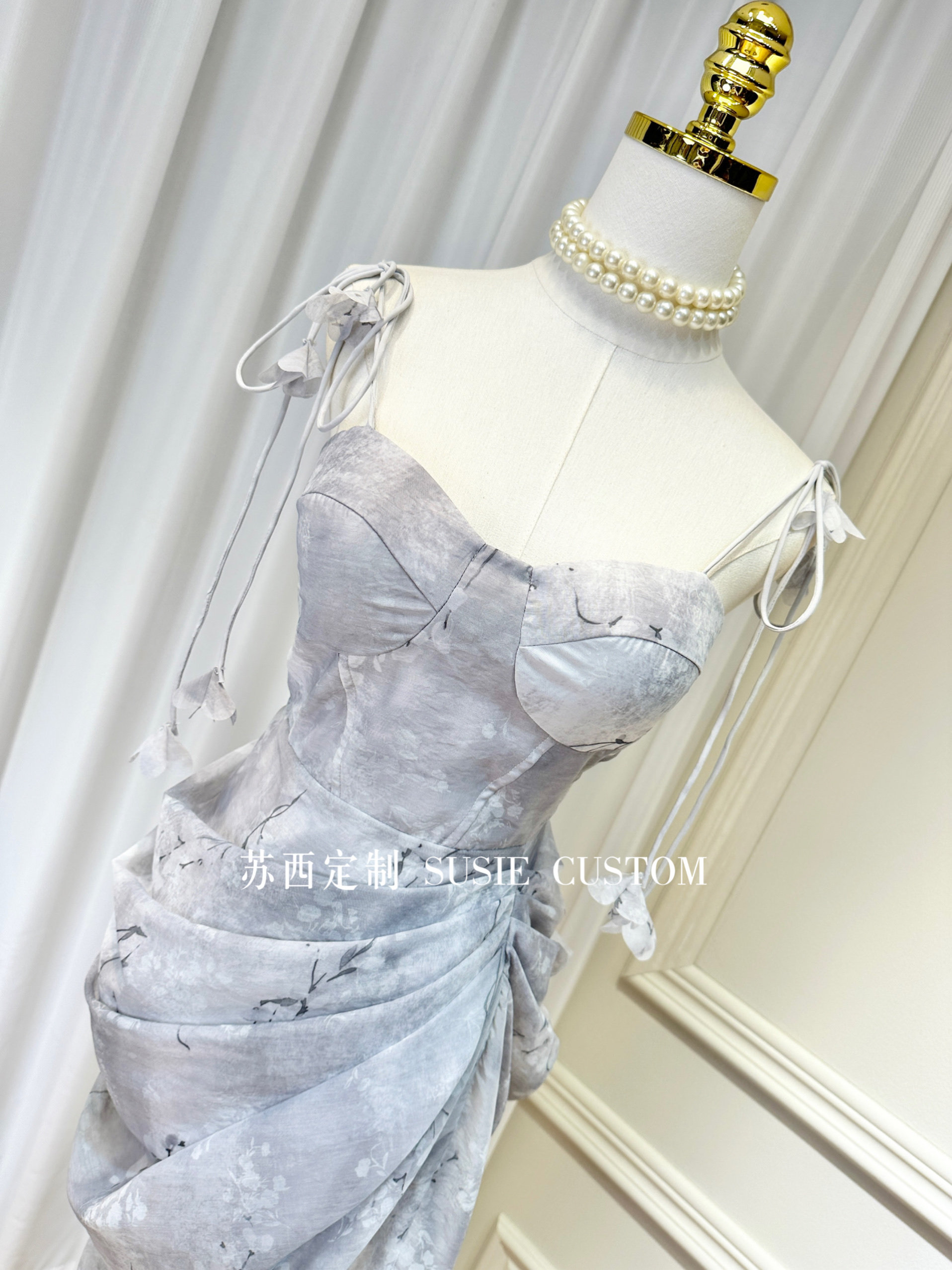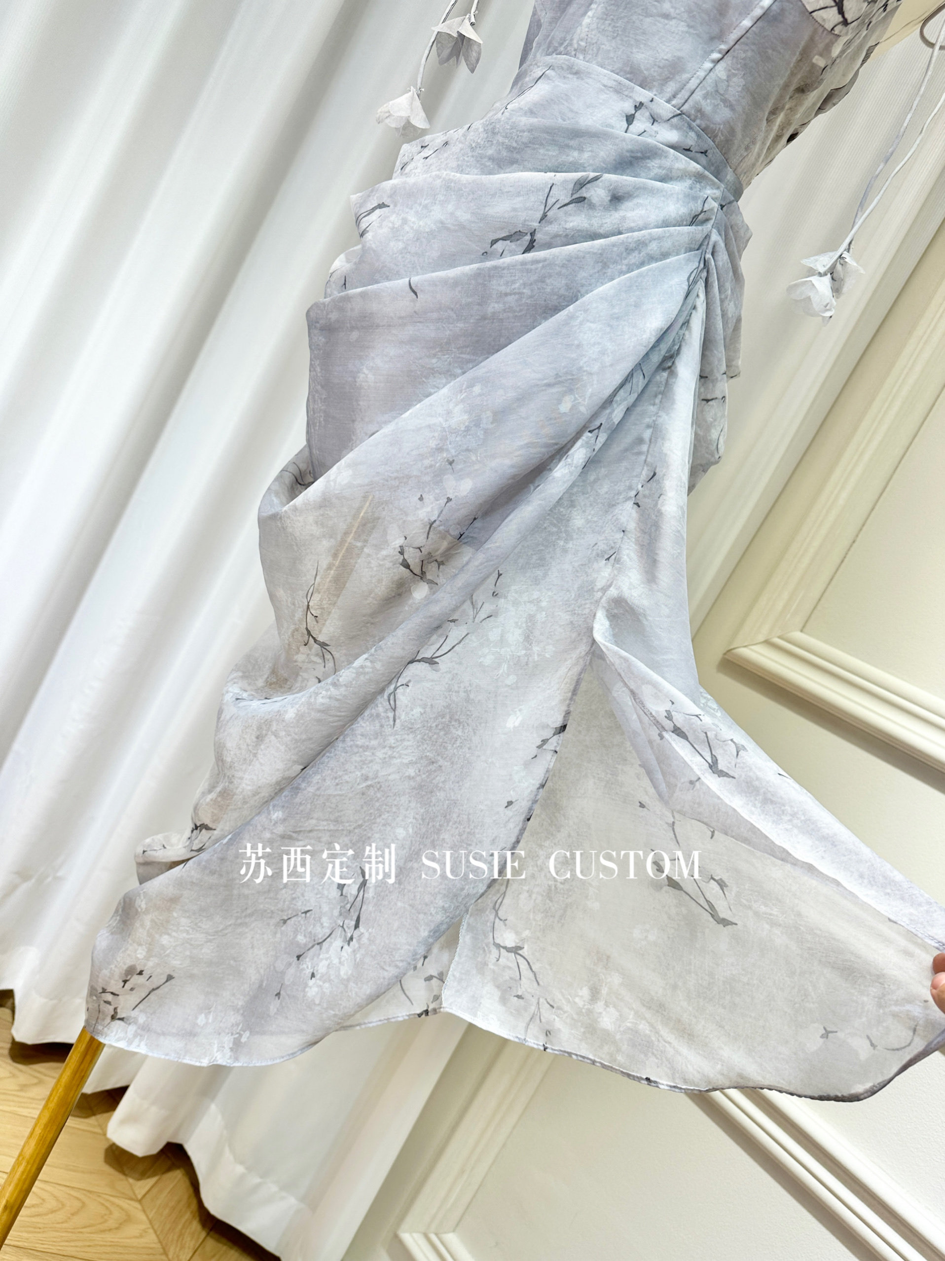 温柔设计款轻纱烟灰晕染印花绑带花瓣带胸垫褶皱不规则开叉中长裙