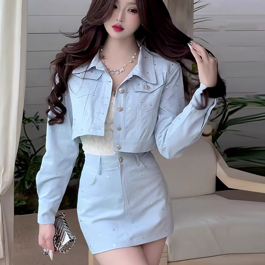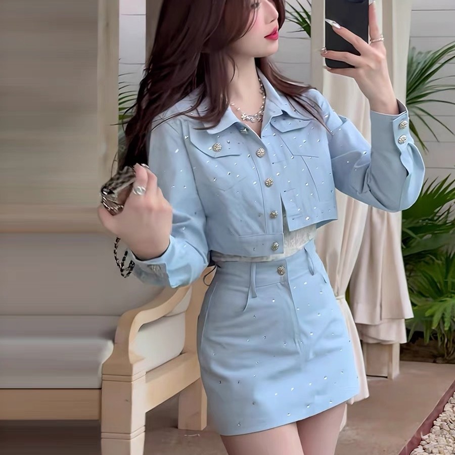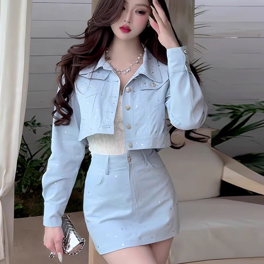 2025早春新款复古烫钻气质重工外套高腰+A字短裙千金感辣妹套装女
