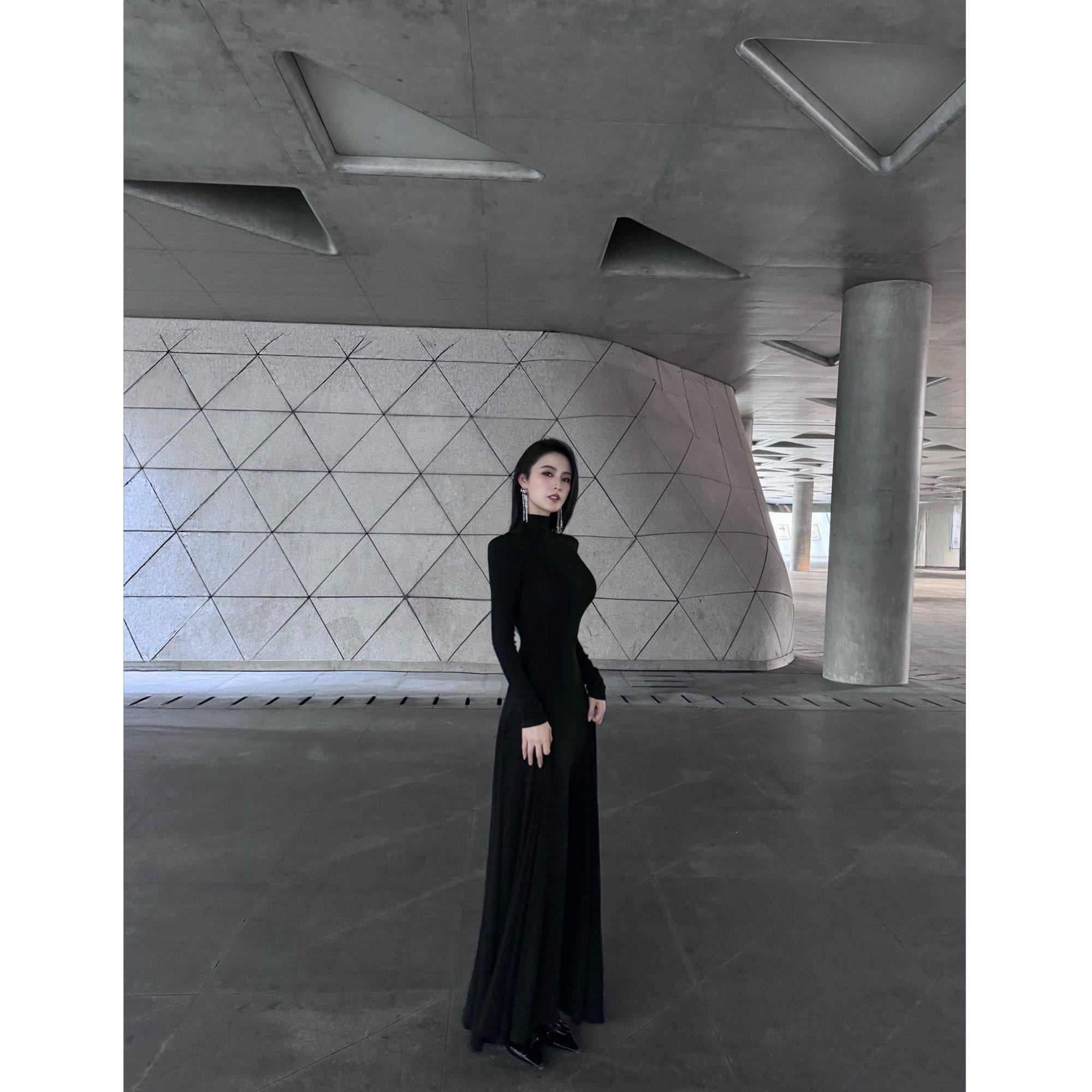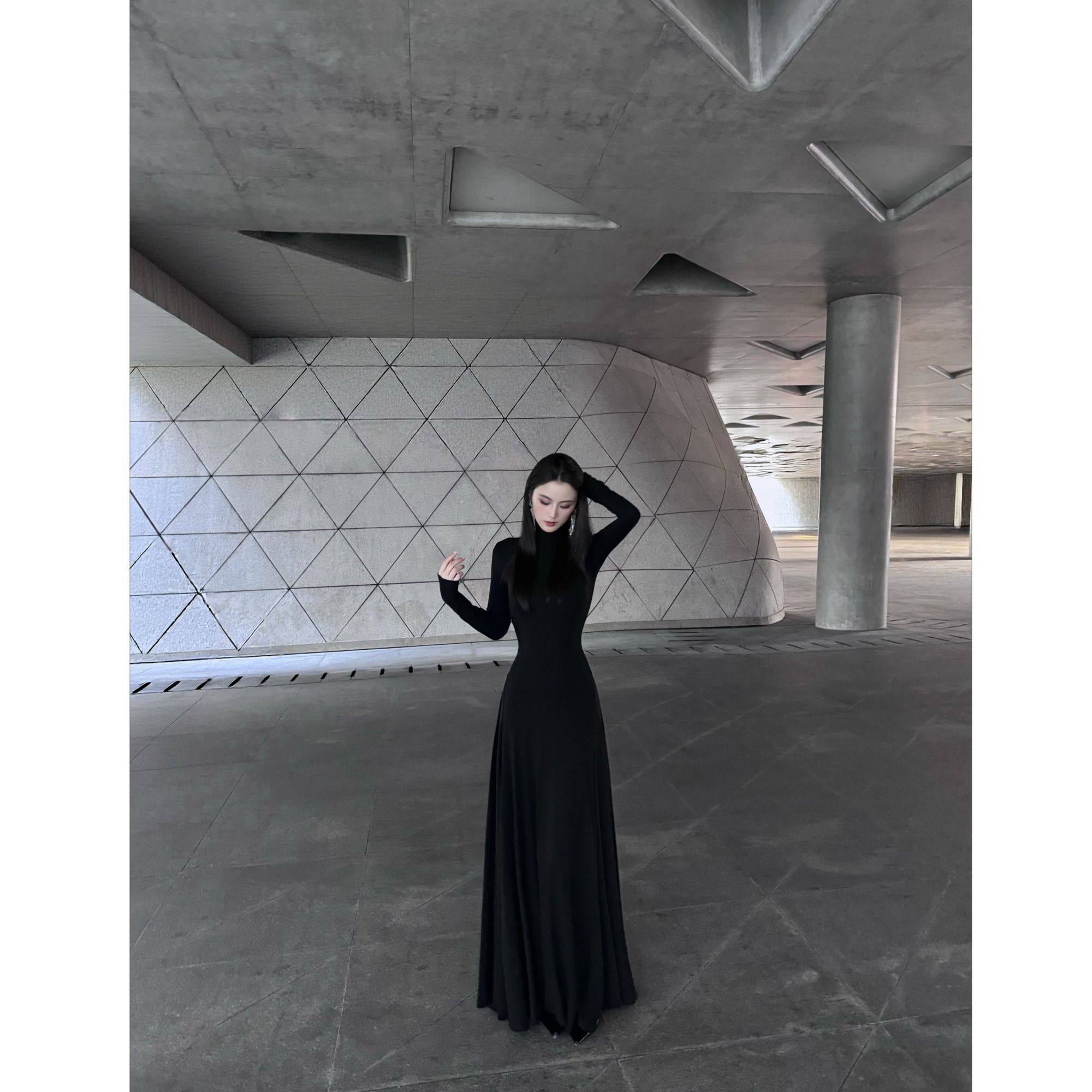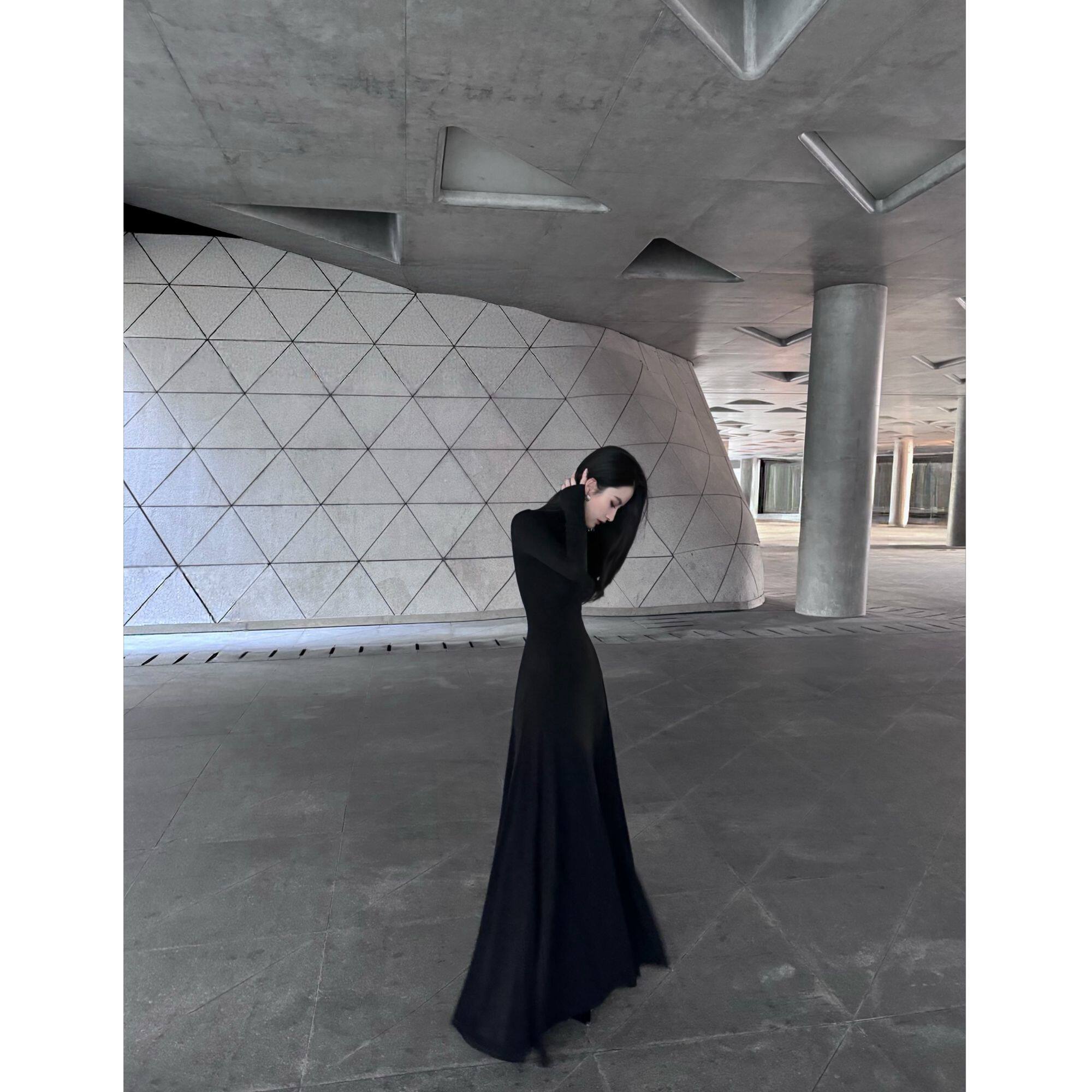 BETTER ME 复古高级工感高领黑色长袖质感简约高雅连衣长裙