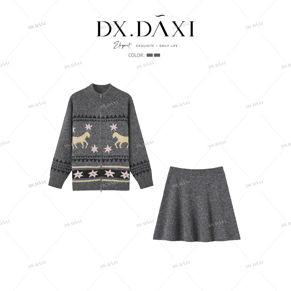 DX.DAXI【海街日记】设计感提花毛衣外套+针织半身裙两件套