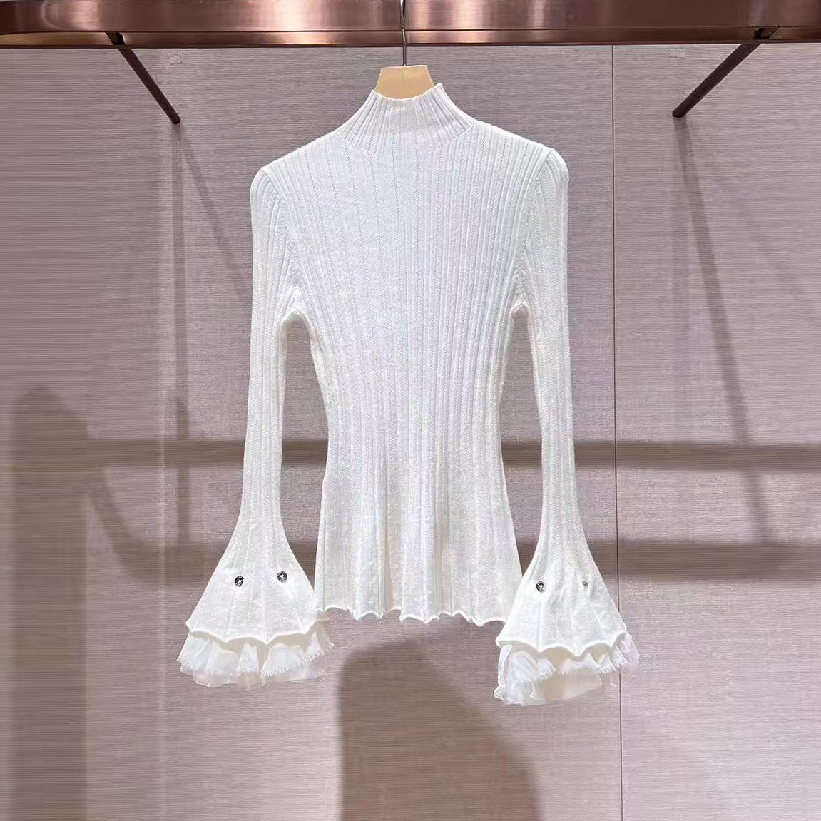 首页> 女装> 现货】深圳南油高端女装25冬季新法式风蕾丝喇叭袖高领打底针织衫