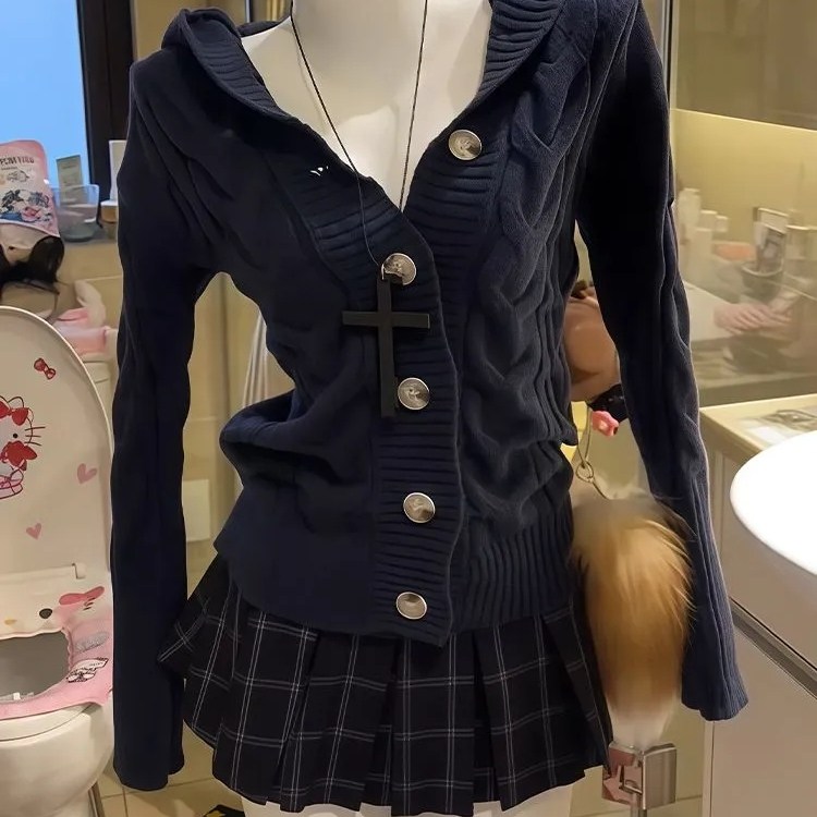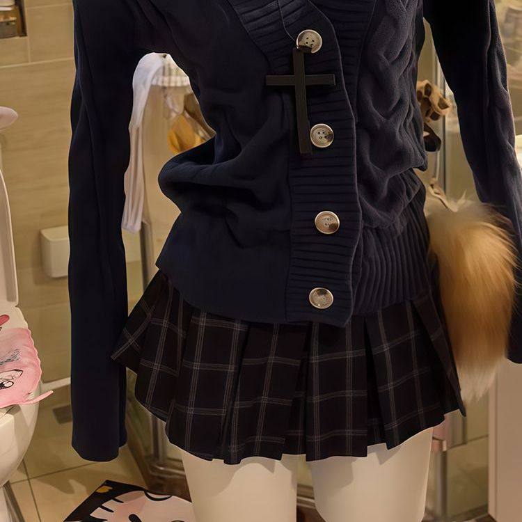 首页> 女装> 【藏青耶鲁】2025秋季新款学院风针织开衫毛衣收腰格纹百褶裙套装