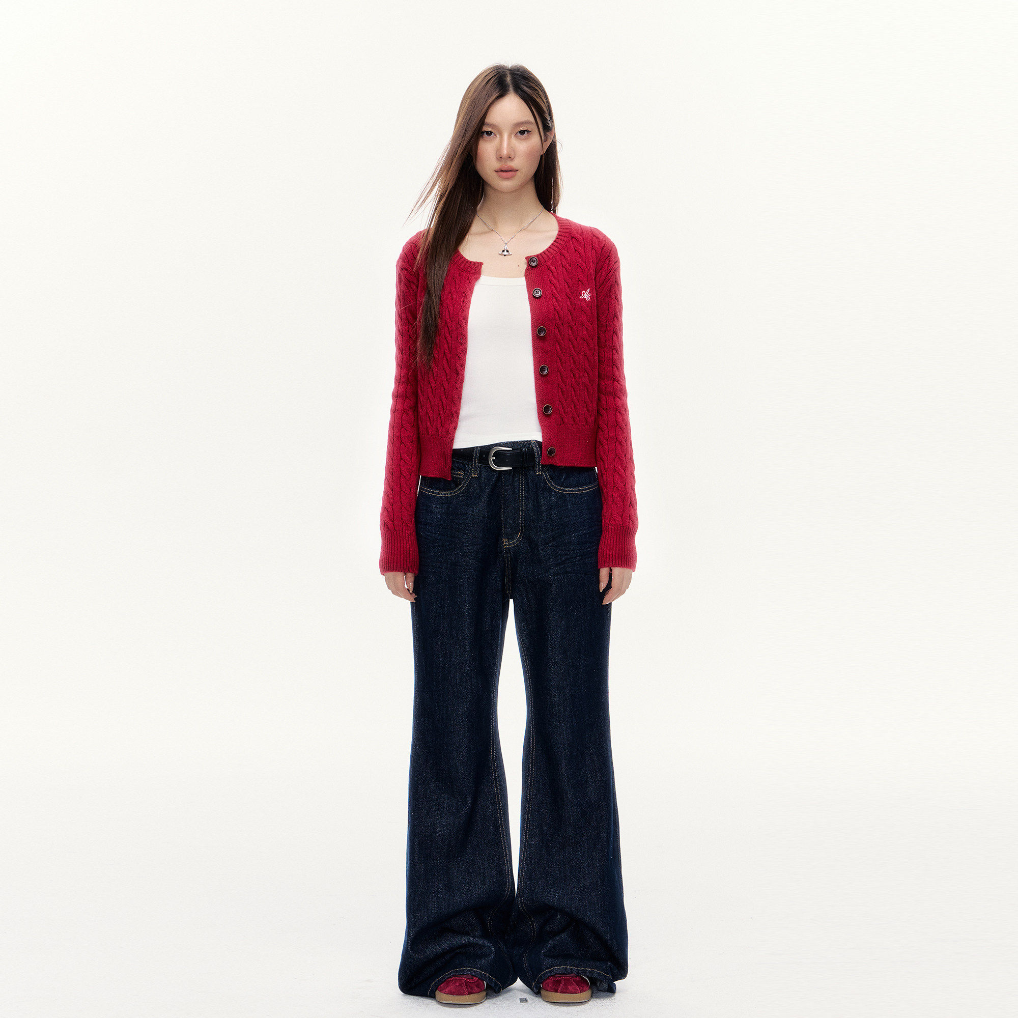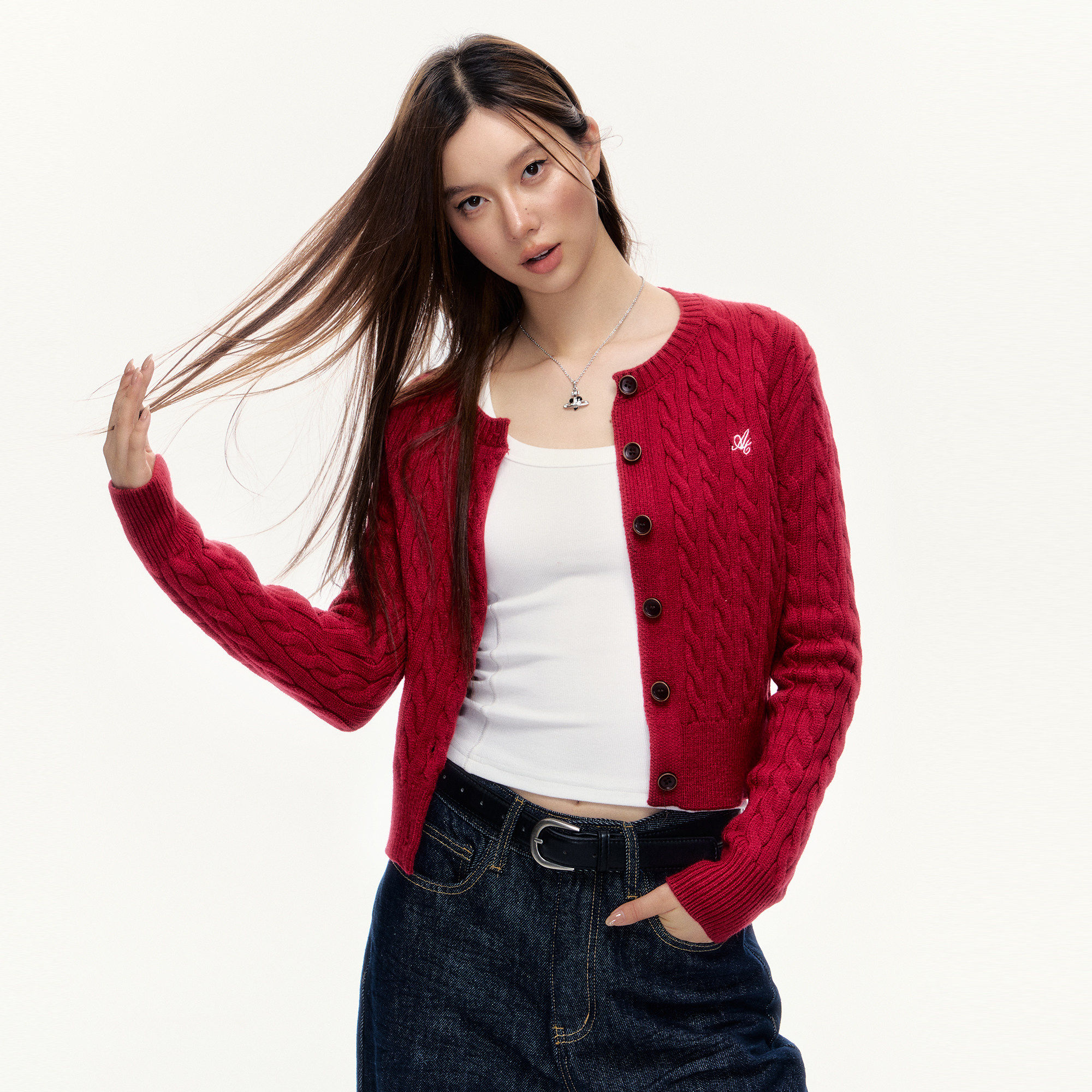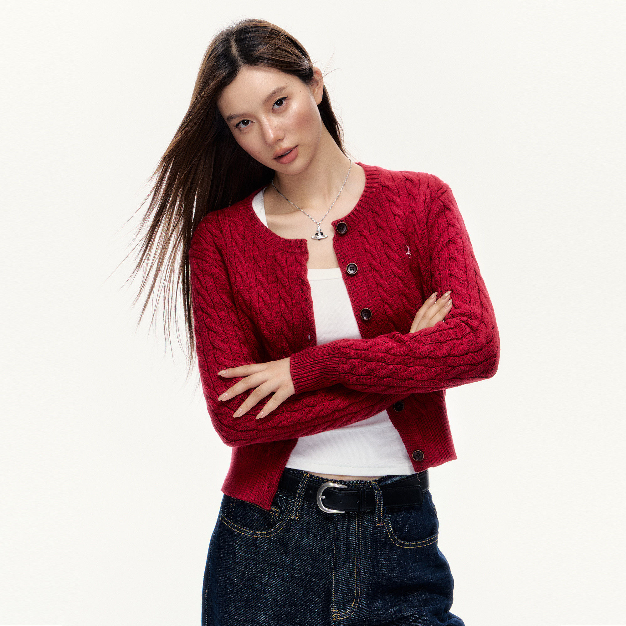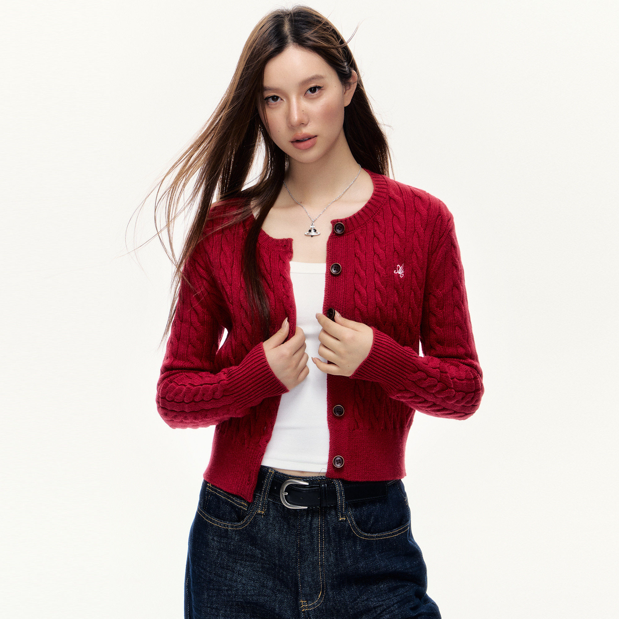101PASSION酒红色针织开衫女秋季高级感麻花毛衣修身显瘦短款外套