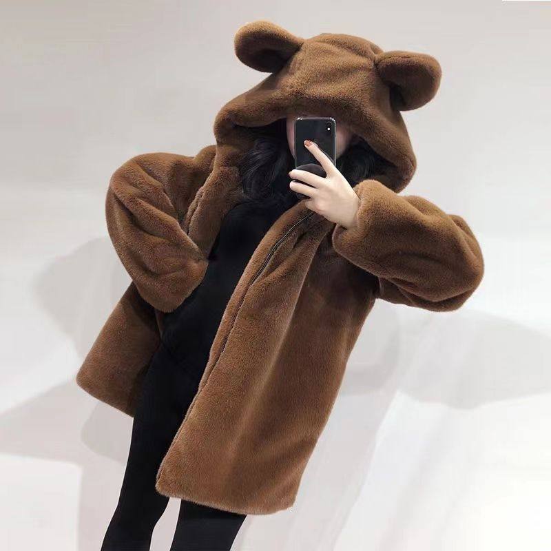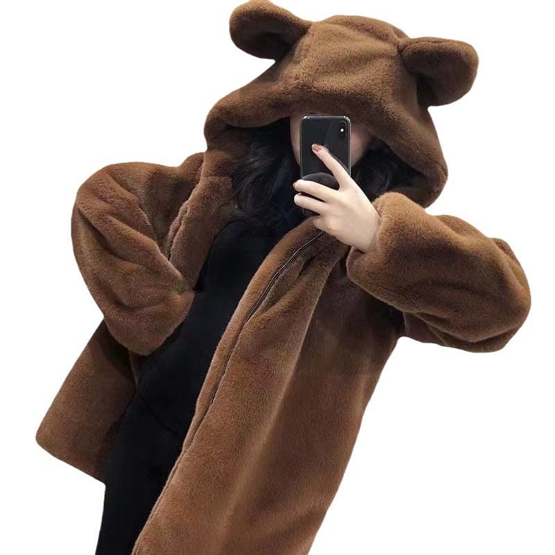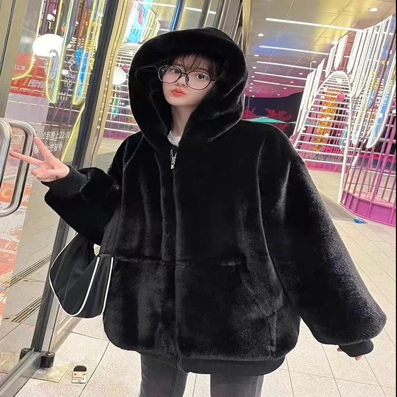2025韩版宽松毛绒绒外套女冬仿獭兔羊羔绒中长款加厚连帽外衣