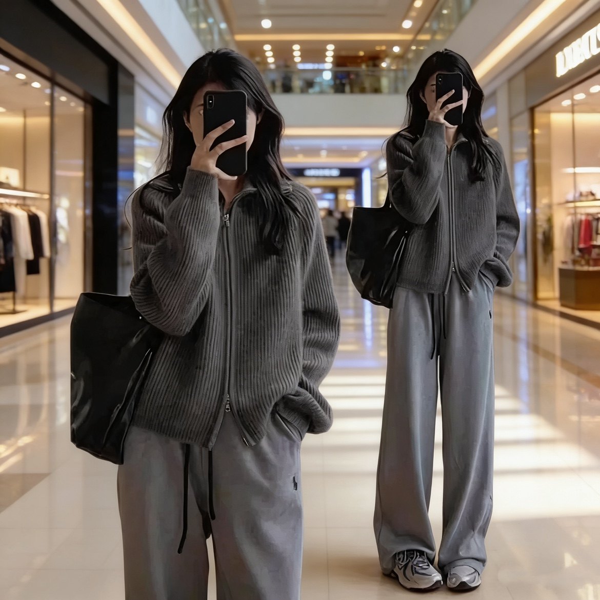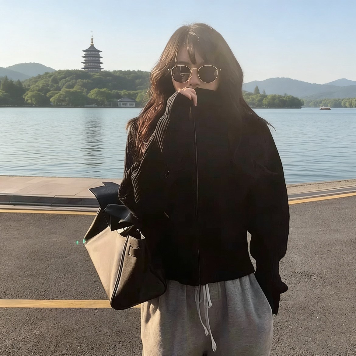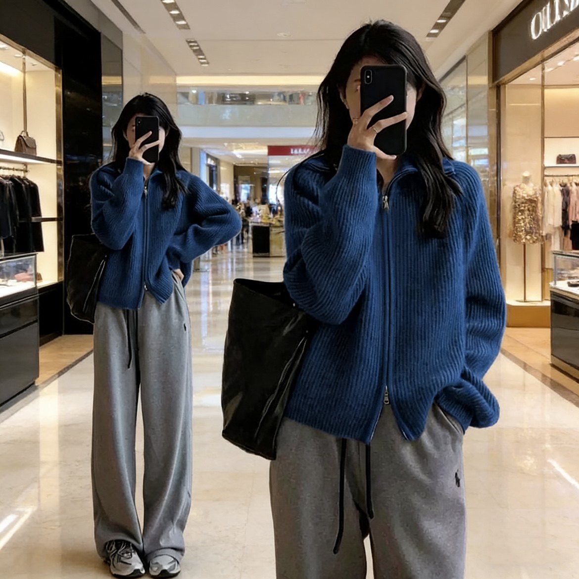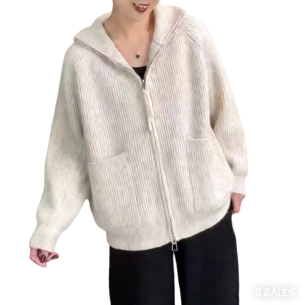 日系复古立领拉链针织开衫女秋冬新款宽松慵懒风百搭毛衣外套上衣