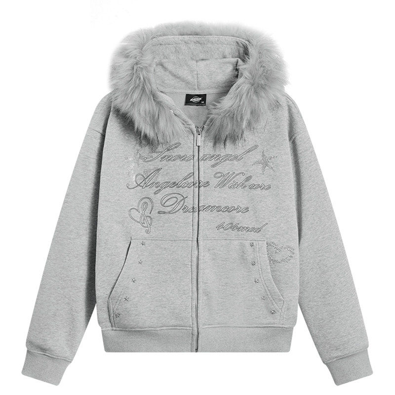 404MOB烫钻字母设计冬季大毛领加厚加绒外套女款短款连帽开衫卫衣