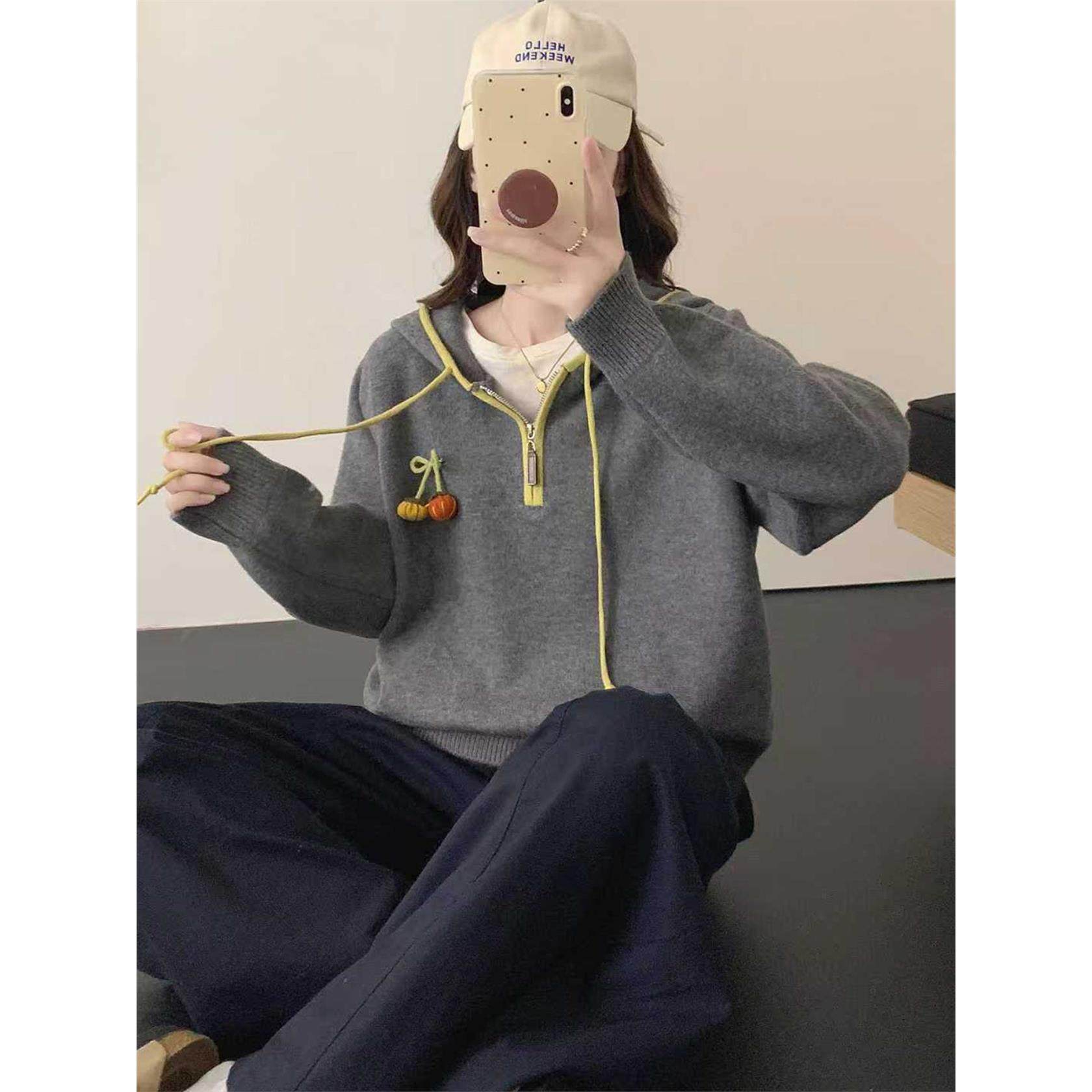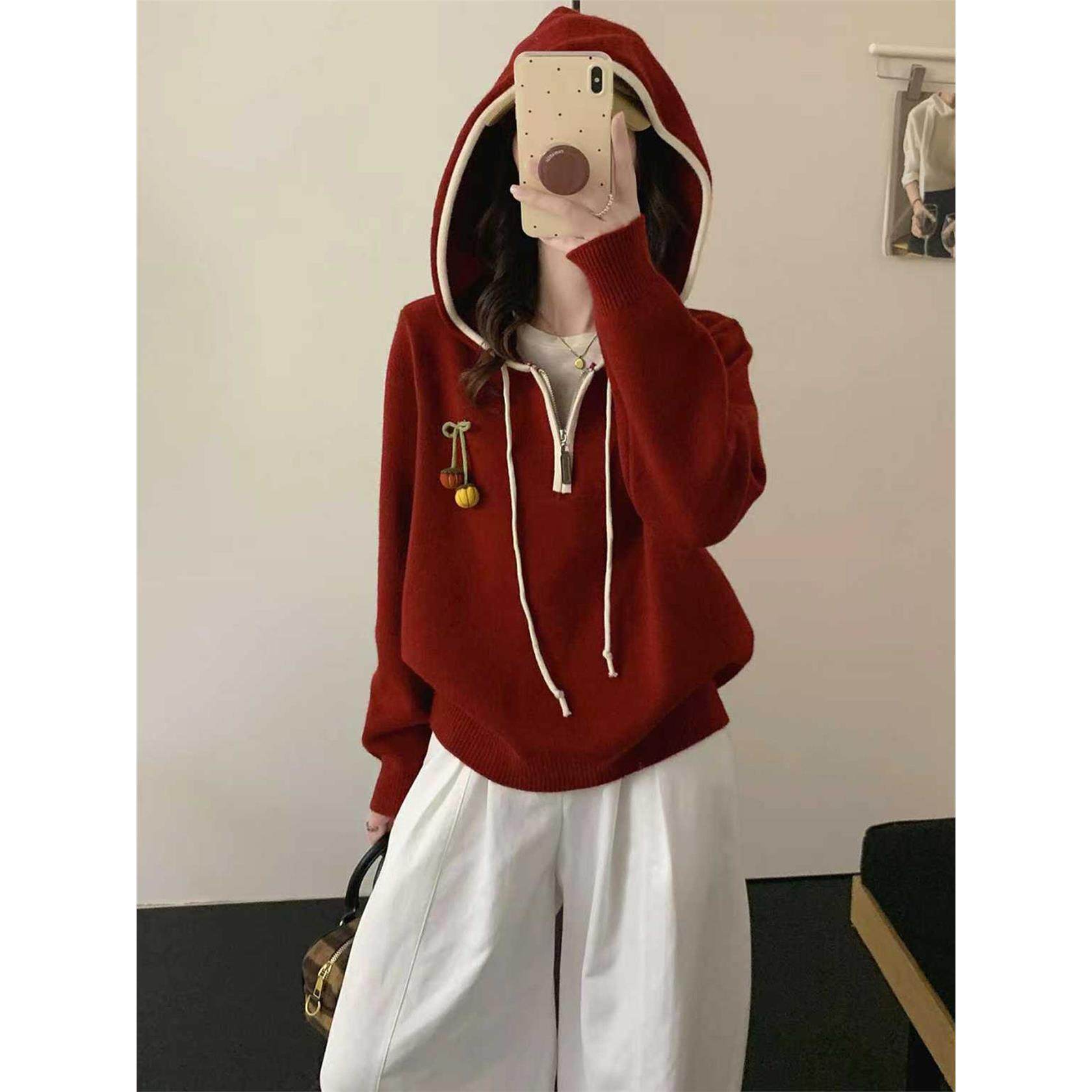 冬季半拉炼连帽红色毛衣女2025新款爆款内搭可外穿针织打底衫秋冬