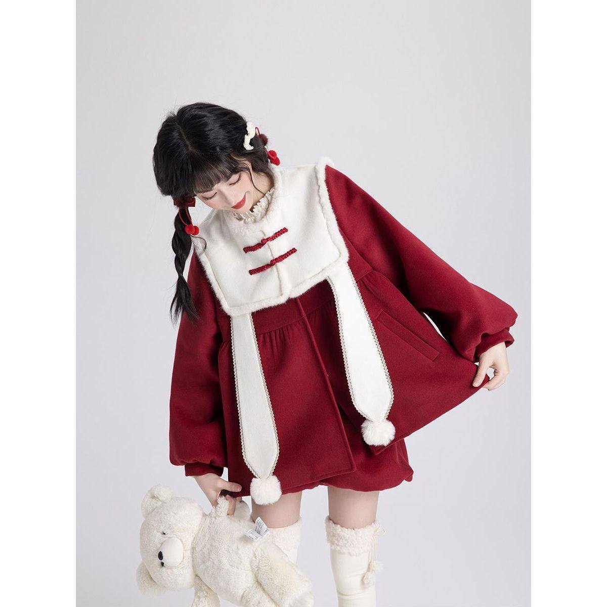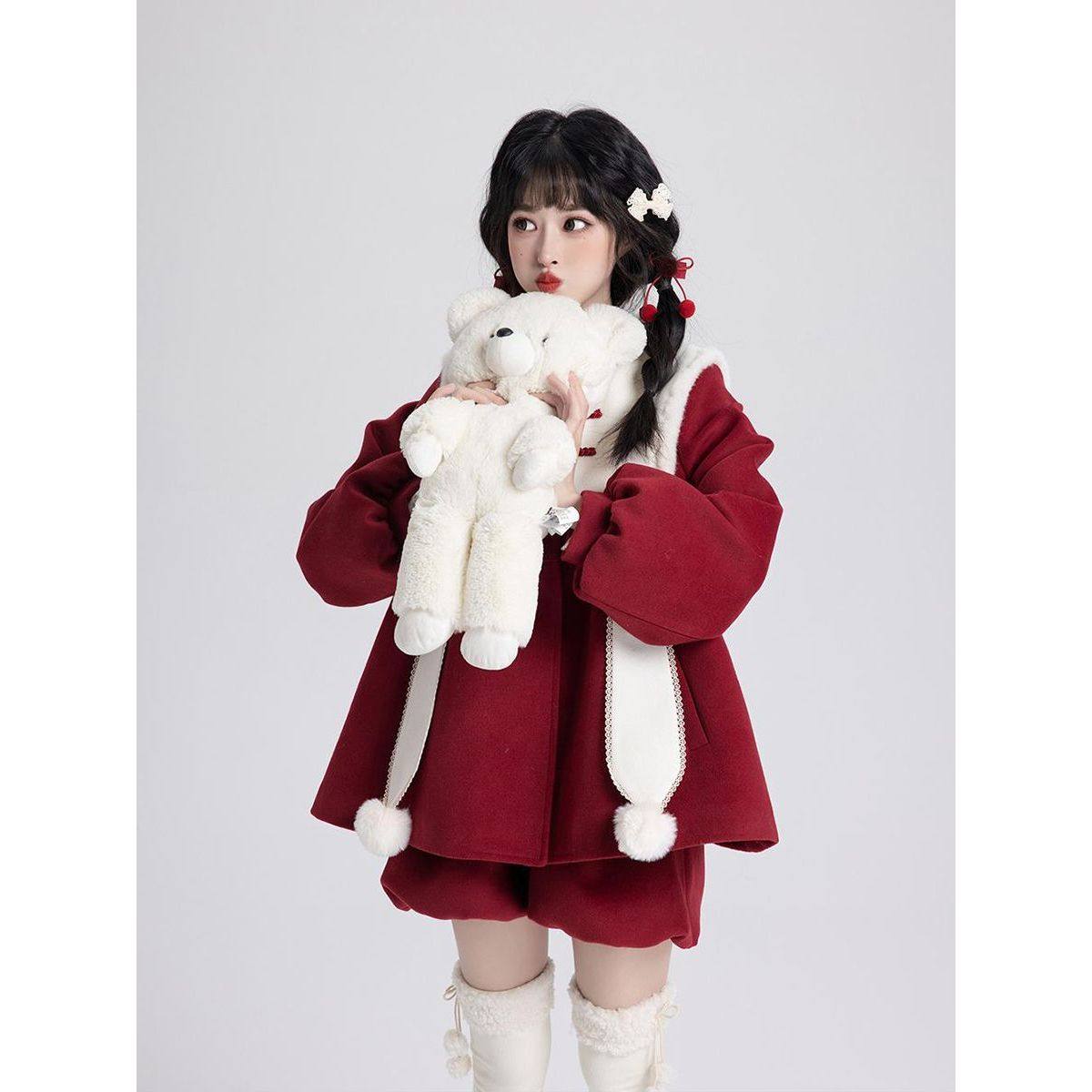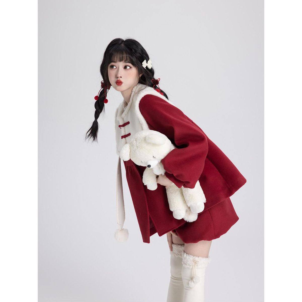 圣诞战袍甜美夹棉毛呢套装冬季新款红色盘扣小个子外套短裤两件套