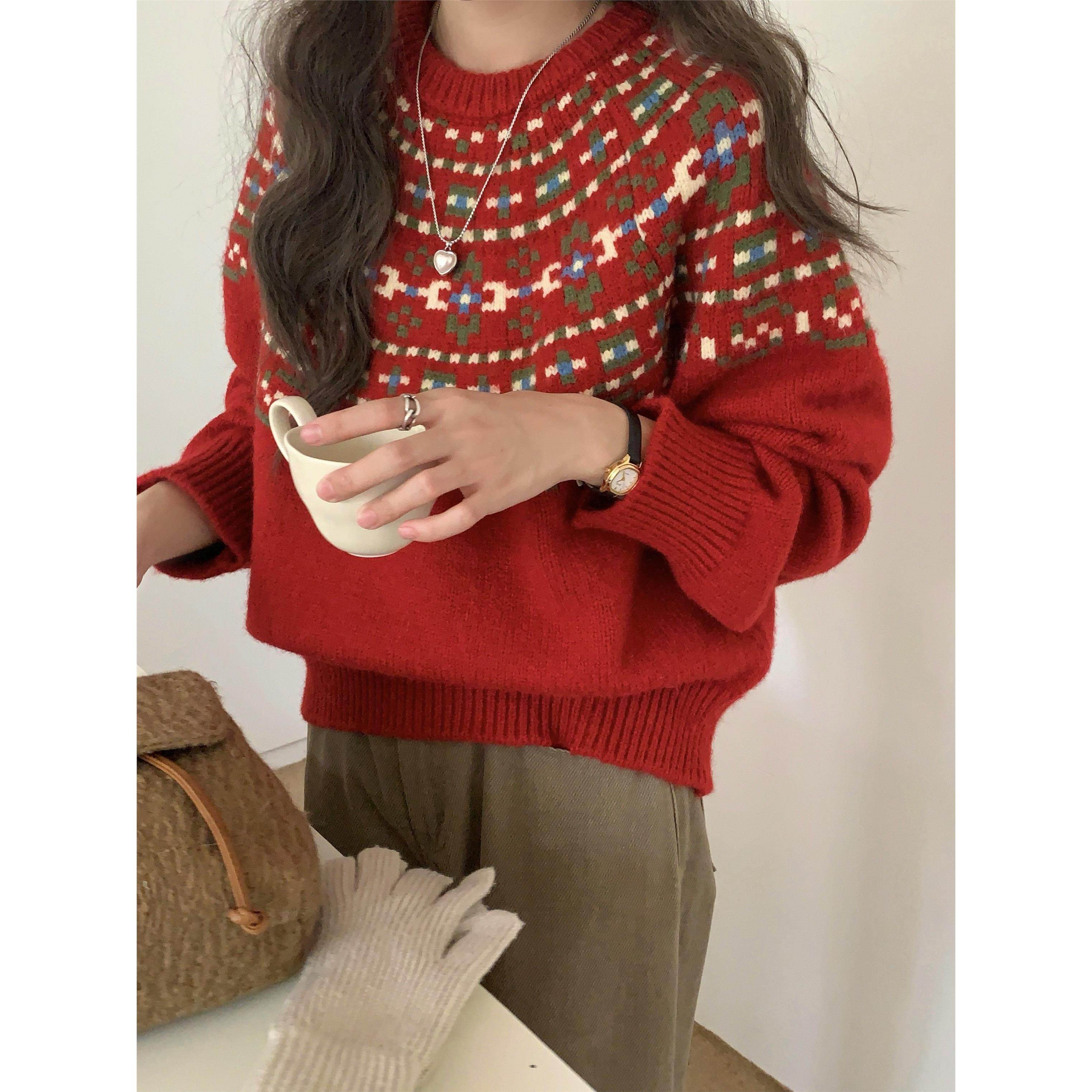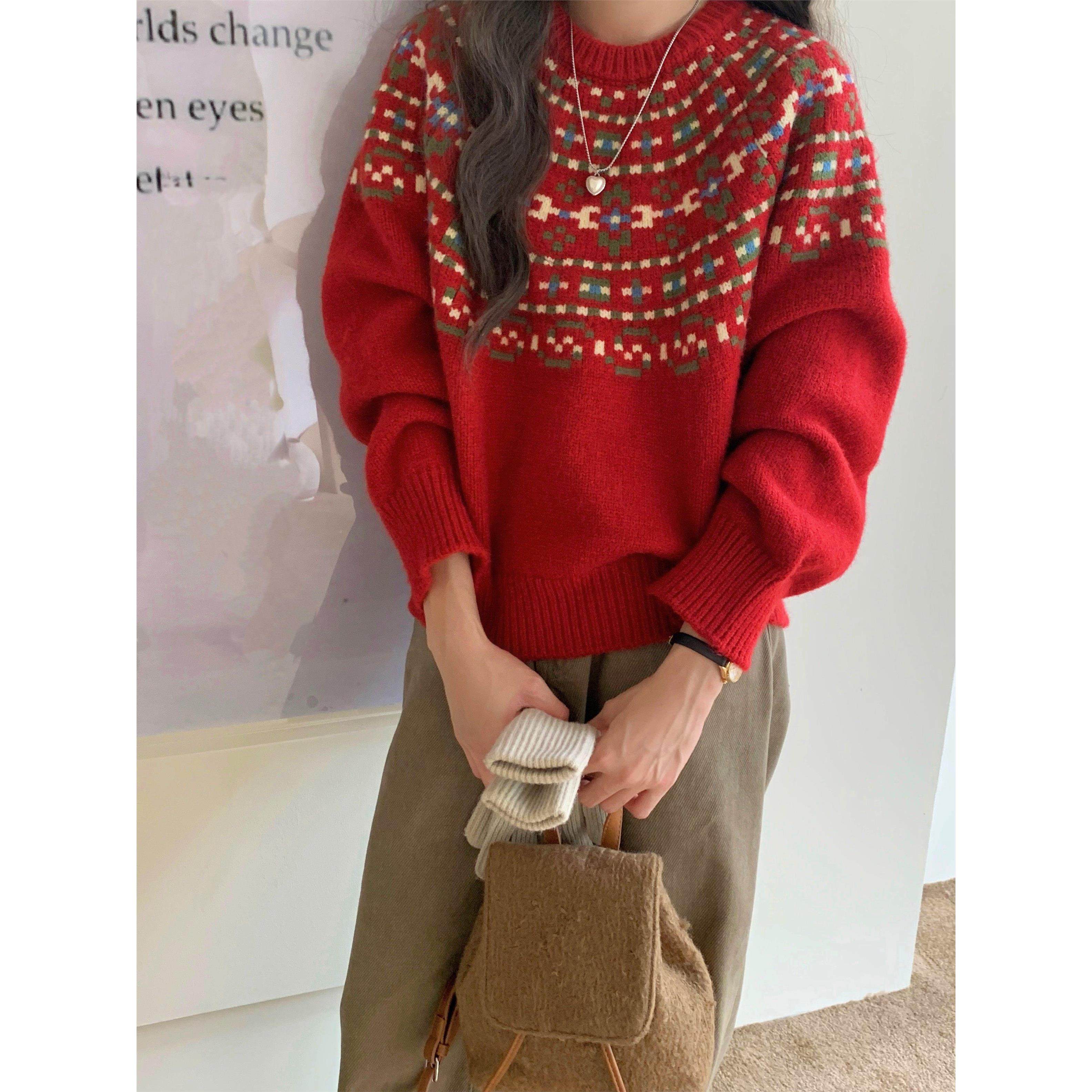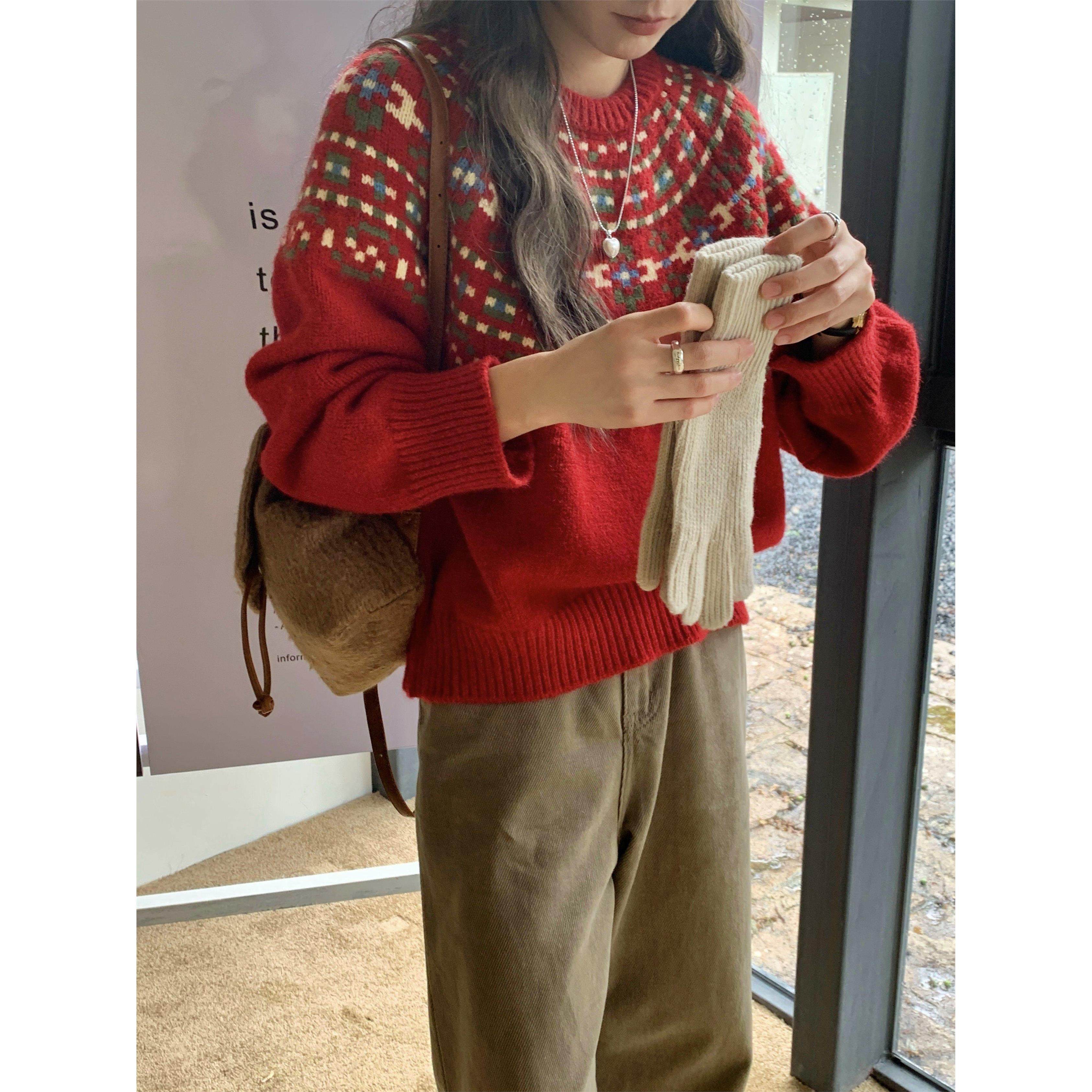 氛围感!圣诞红色覆古小个子慵懒风毛衣女宽松费尔岛小众秋冬上衣