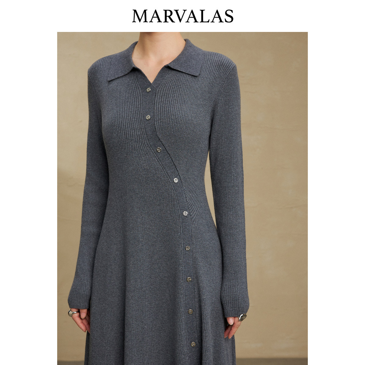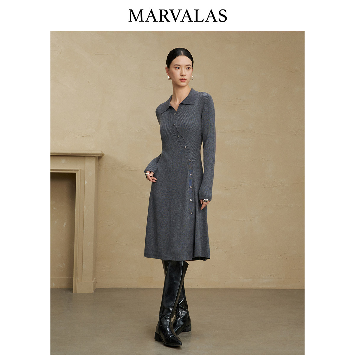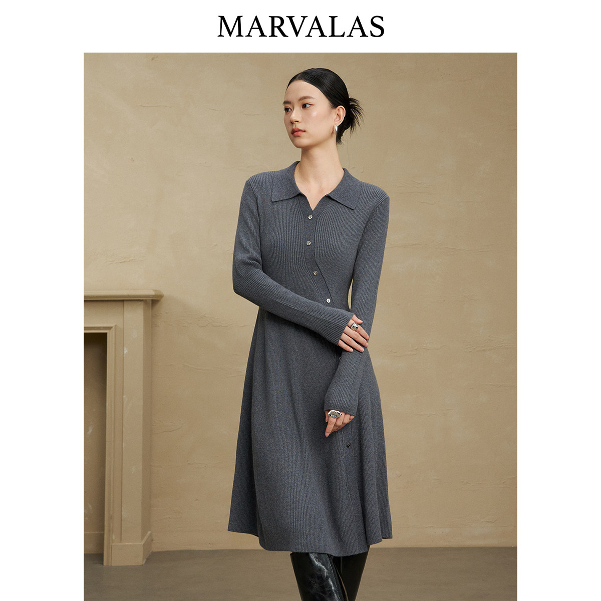【粉丝专属】曼德诗纯色连衣裙女2025冬季新款绵羊毛混纺裙