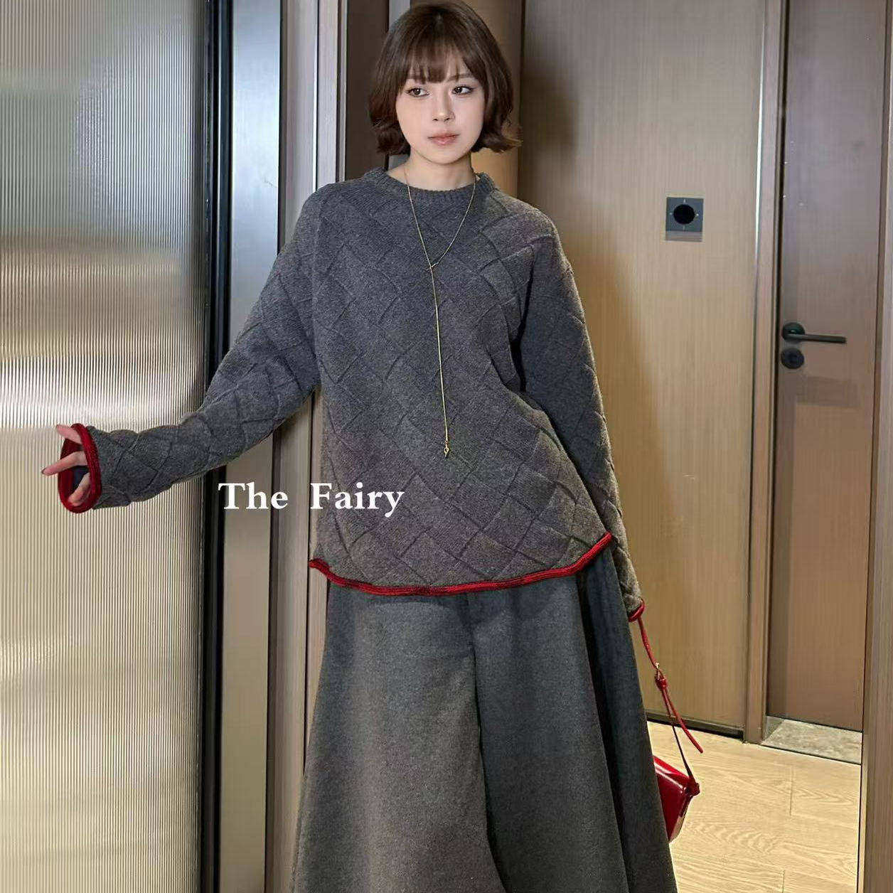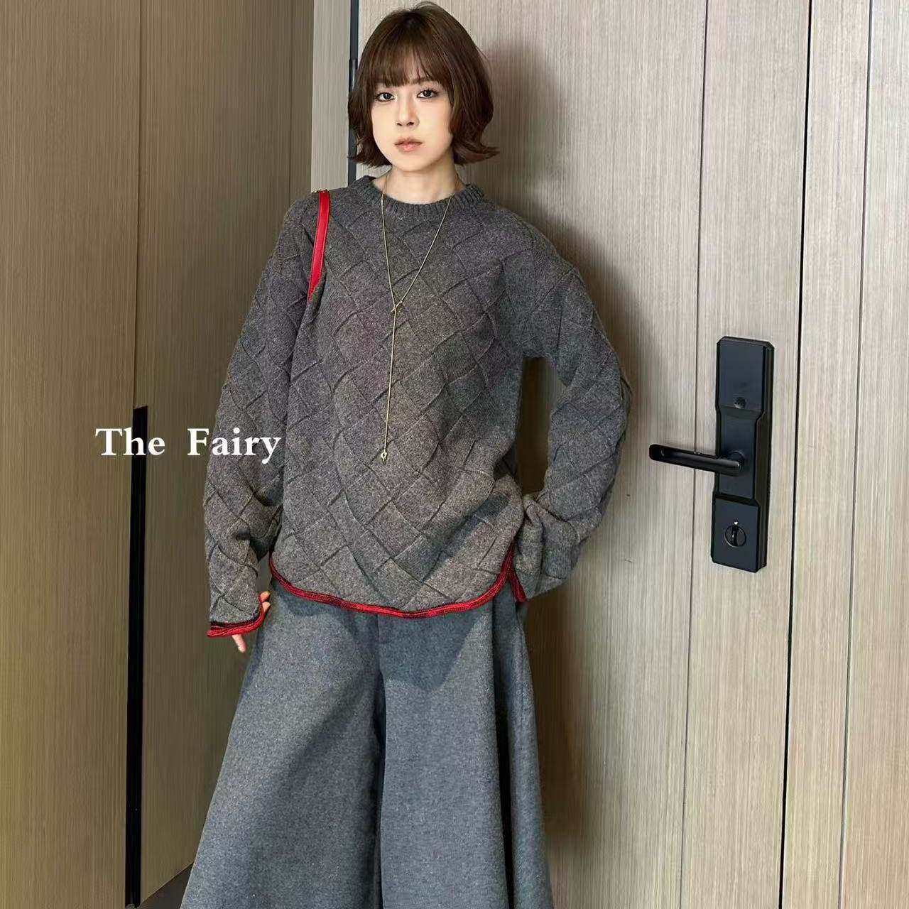好漂亮好漂亮灰色菱形格纹红边针织毛衣女2025年冬季新款套头衫潮