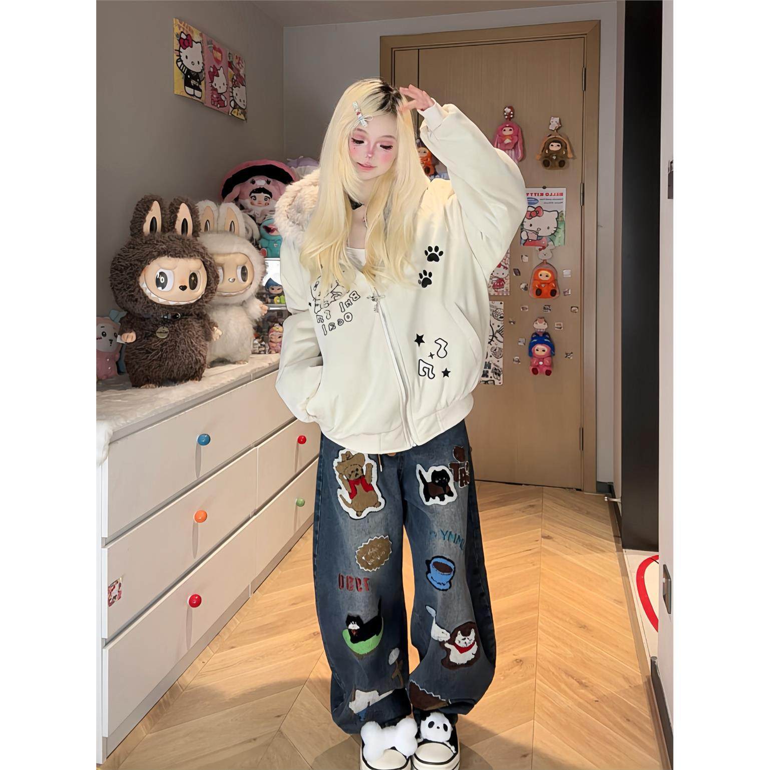 凛可爱 小众设计kt刺绣加厚毛绒外套女秋冬宽松休闲保暖夹棉上衣