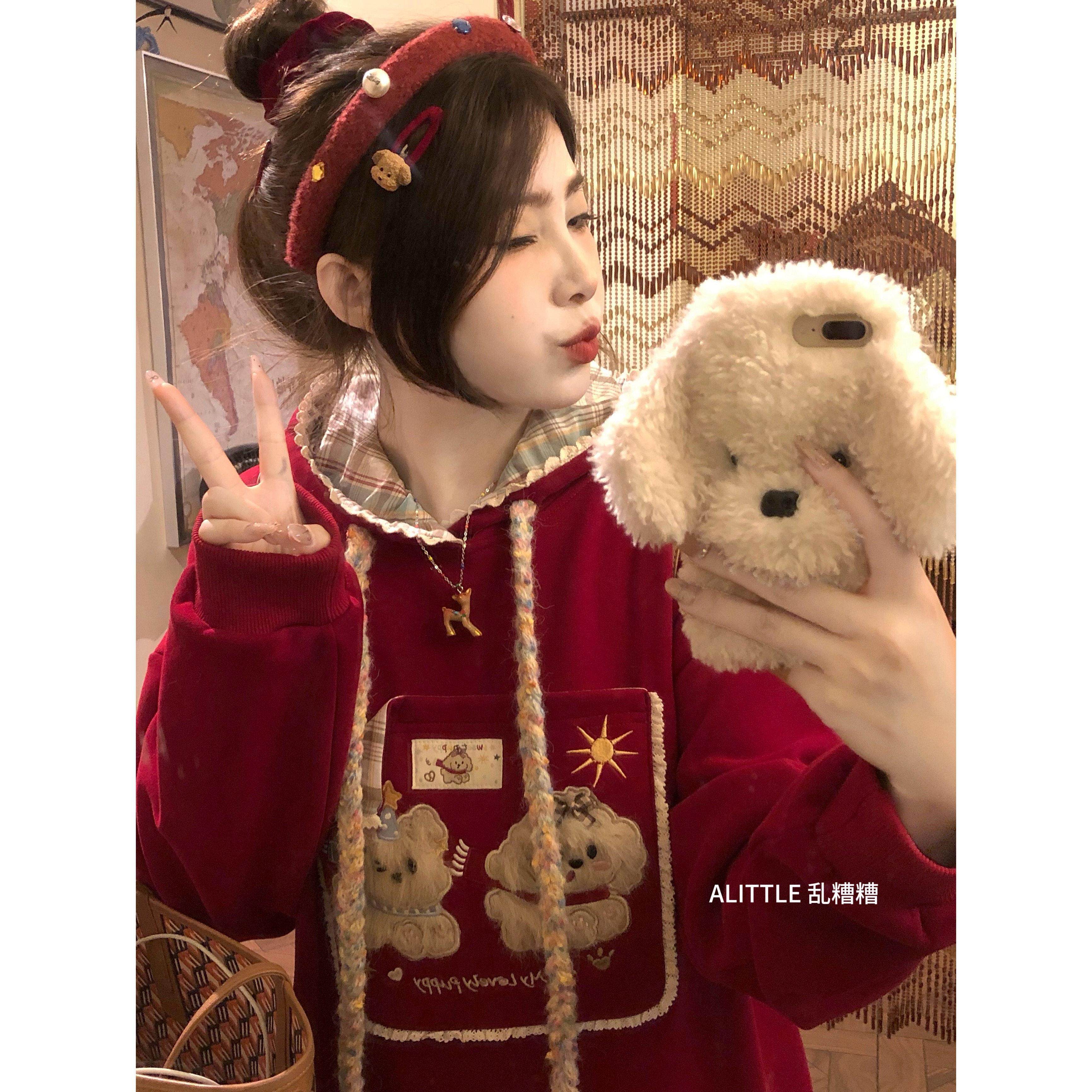 口袋毛绒小狗连帽卫衣女秋冬新款韩系贴布绣加绒学院风外套上衣潮