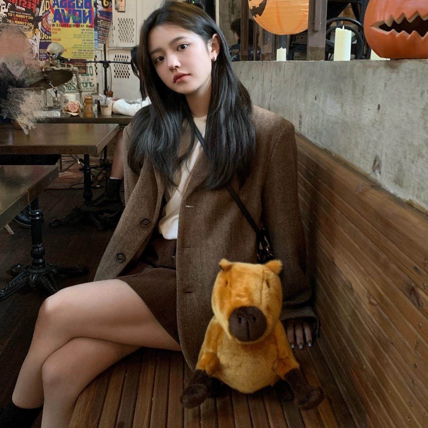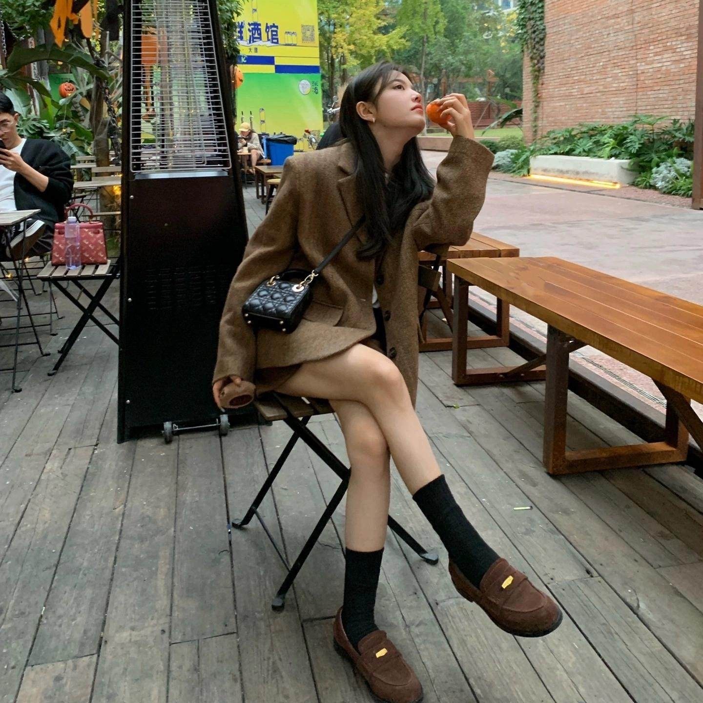咖色正肩人字纹韩系法式复古夹棉羊毛呢小西装外套女高级感上衣女