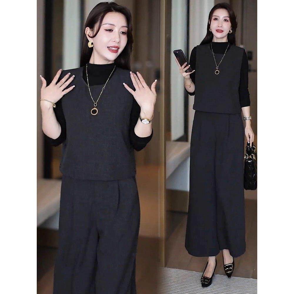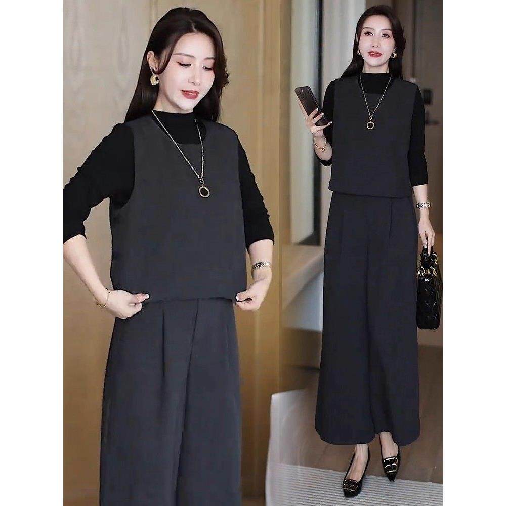 香港代购时尚套装女秋季新款显瘦马甲打底衫高腰阔腿裤减龄三件套