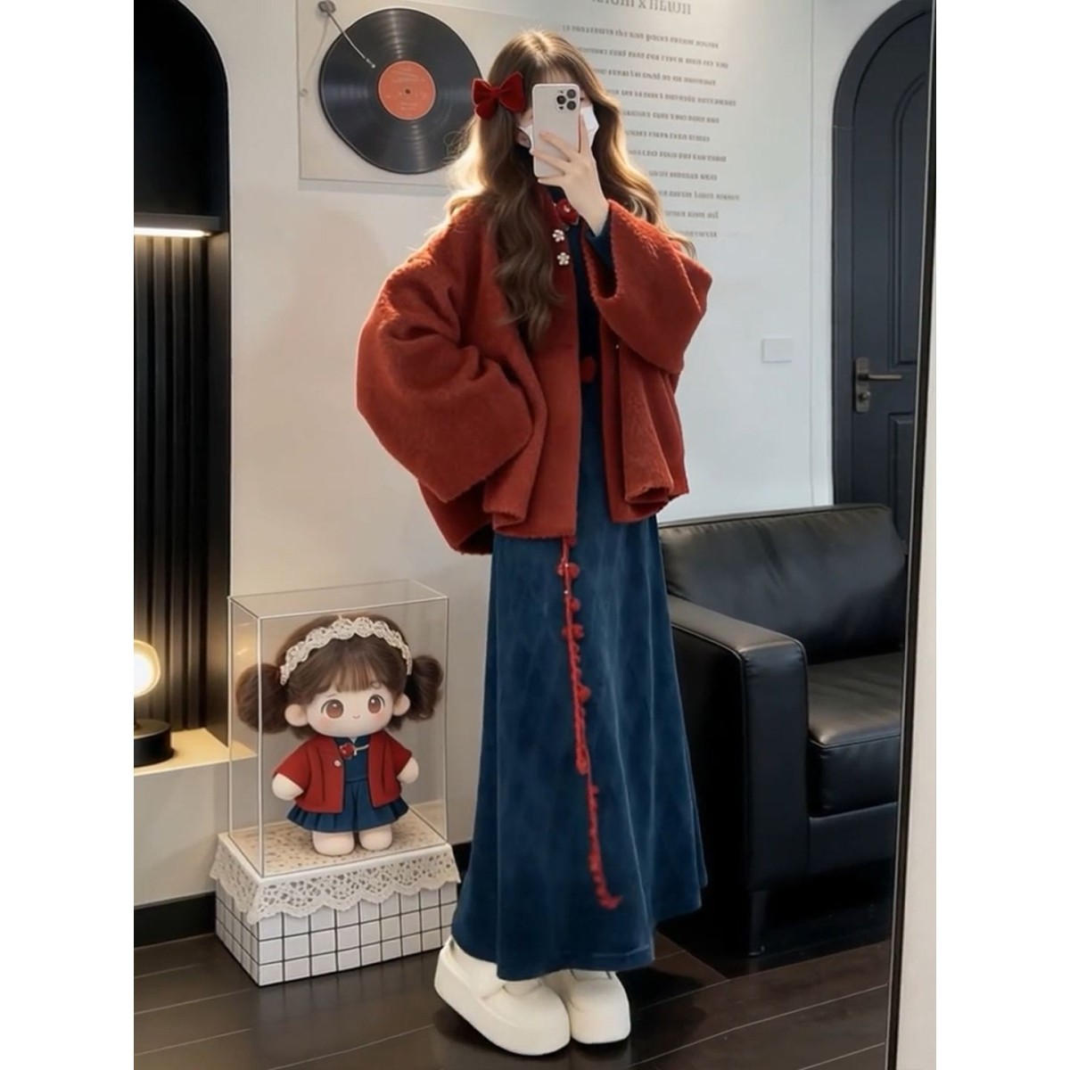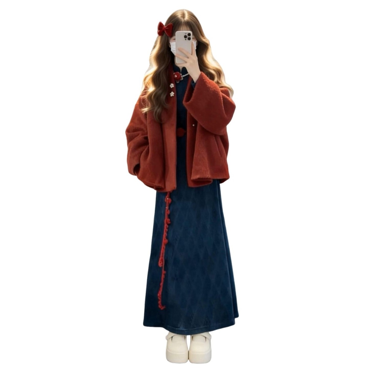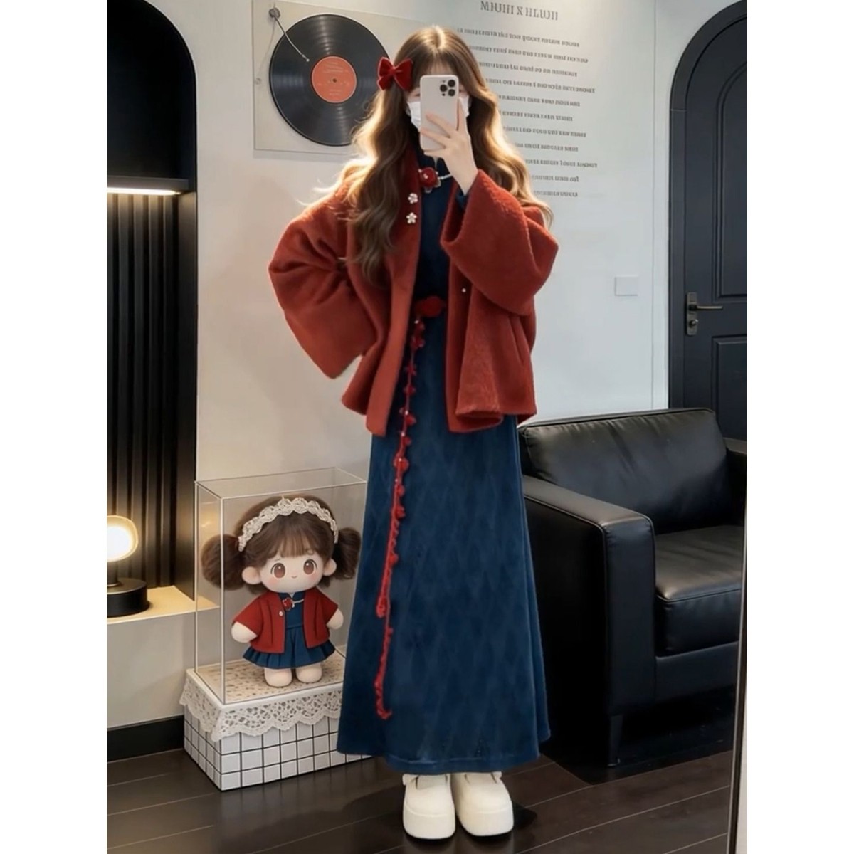 超好看冬装新中式蓝色旗袍连衣裙子女秋冬季2025新款穿搭长裙套装