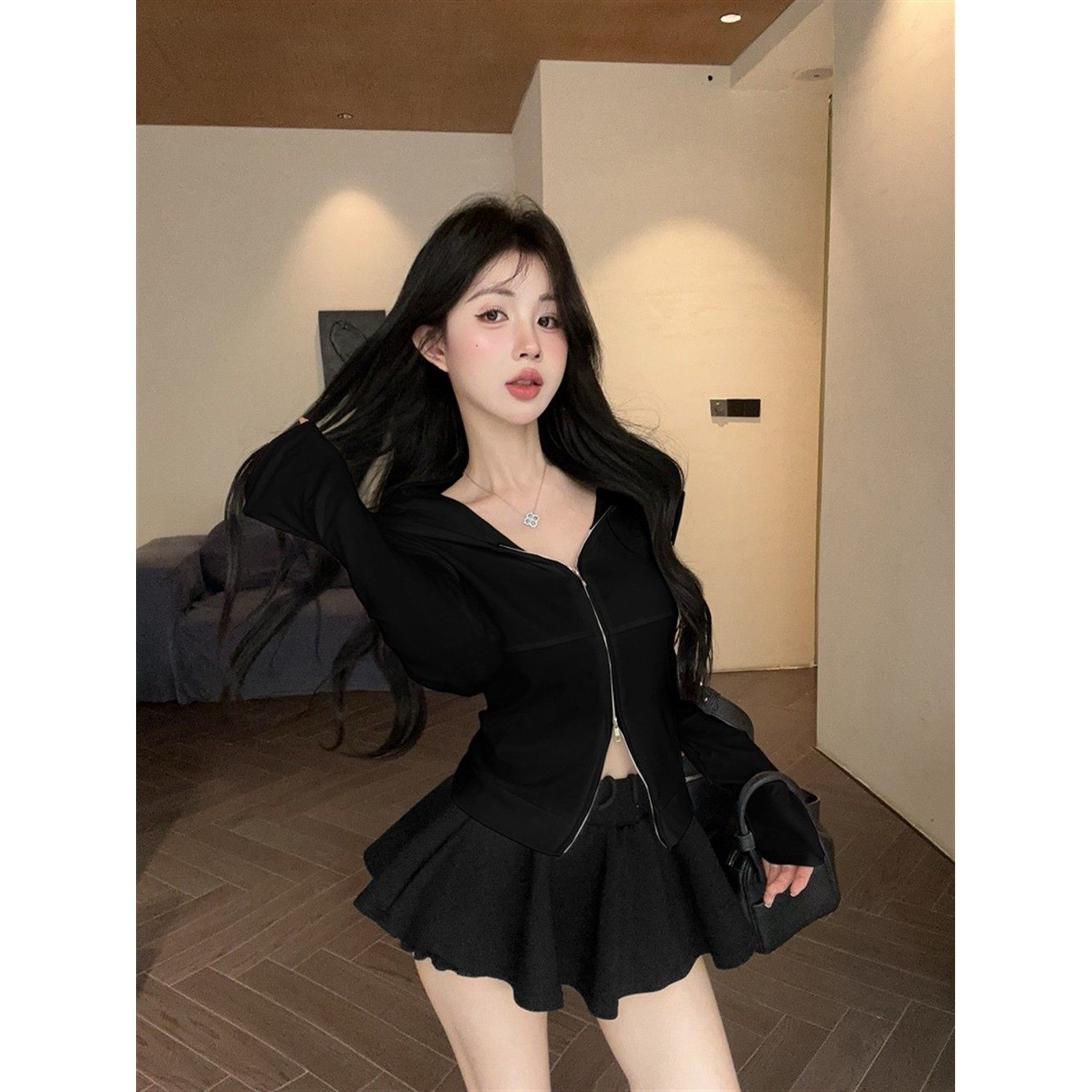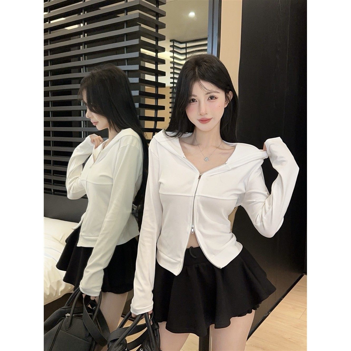 首页> 女装> 双拉链连帽长袖t恤女2025秋季新款辣妹短款上衣卫衣
